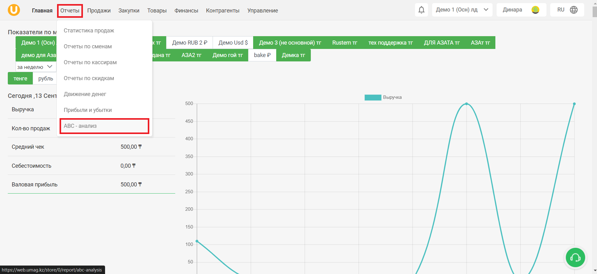 Для того, чтобы перейти в раздел “ABC-анализ”, на сайте Umag, со своего аккаунта, в верхнем меню выберите “Отчеты” → “ABC-анализ”.