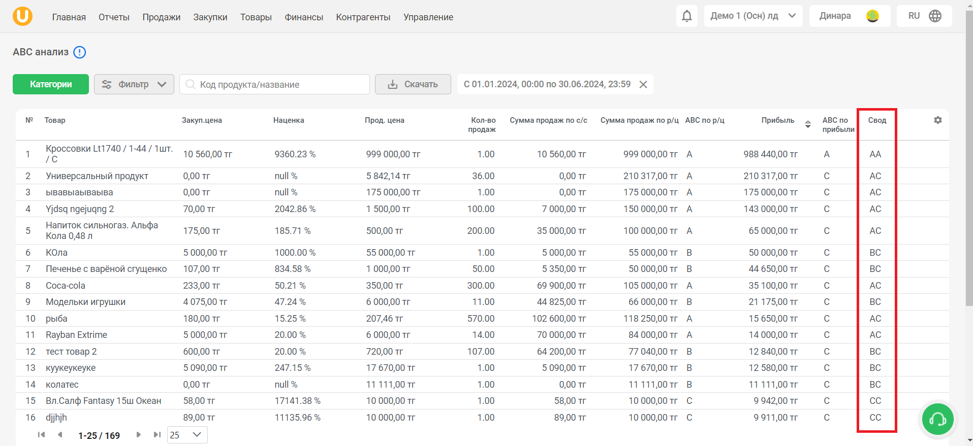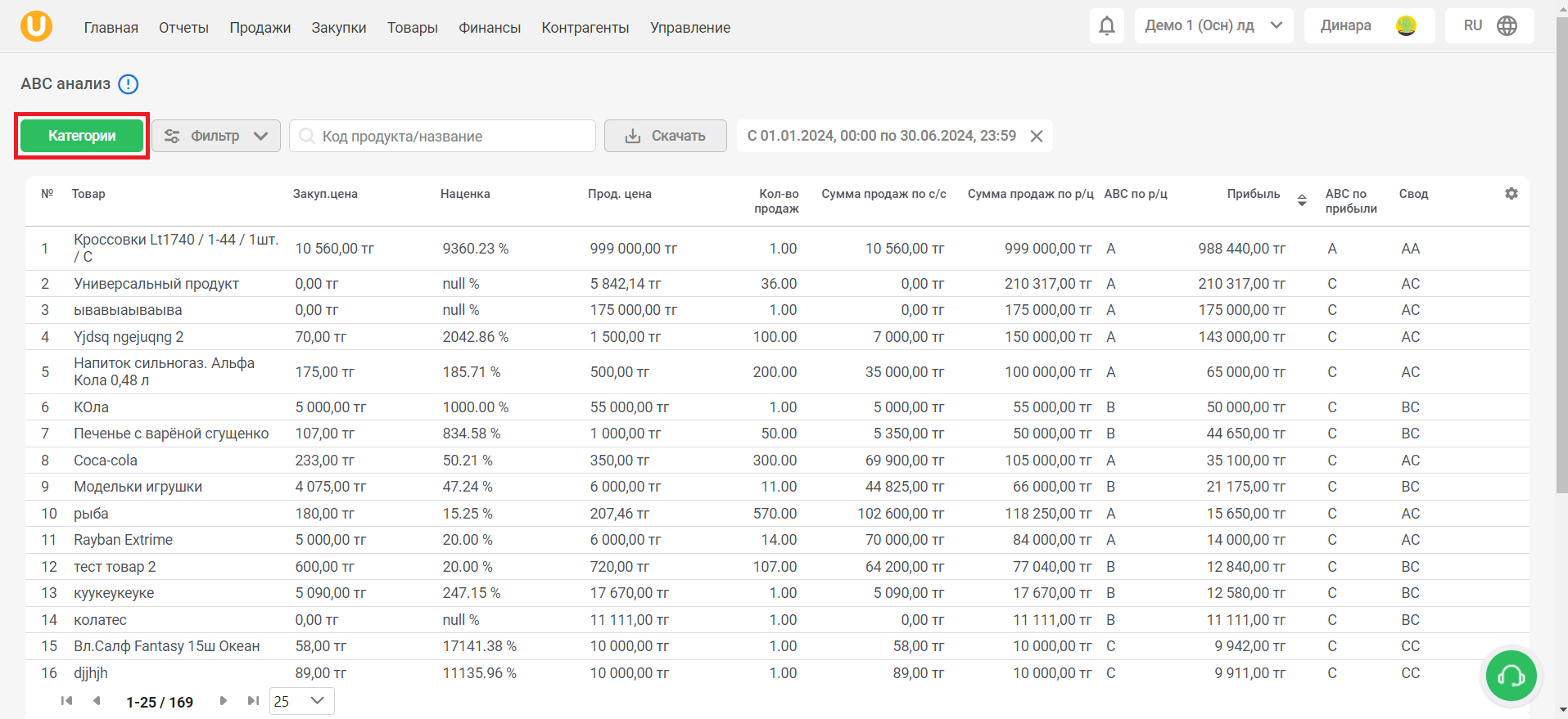 Откроется страница “ABC-анализ”. На этой странице вы можете увидеть таблицу ABC анализа, настроить категории товаров, которые вы хотите проанализировать, настроить фильтр, выполнить поиск товаров в таблице по коду/названию, а также экспортировать таблицу ABC-анализа.