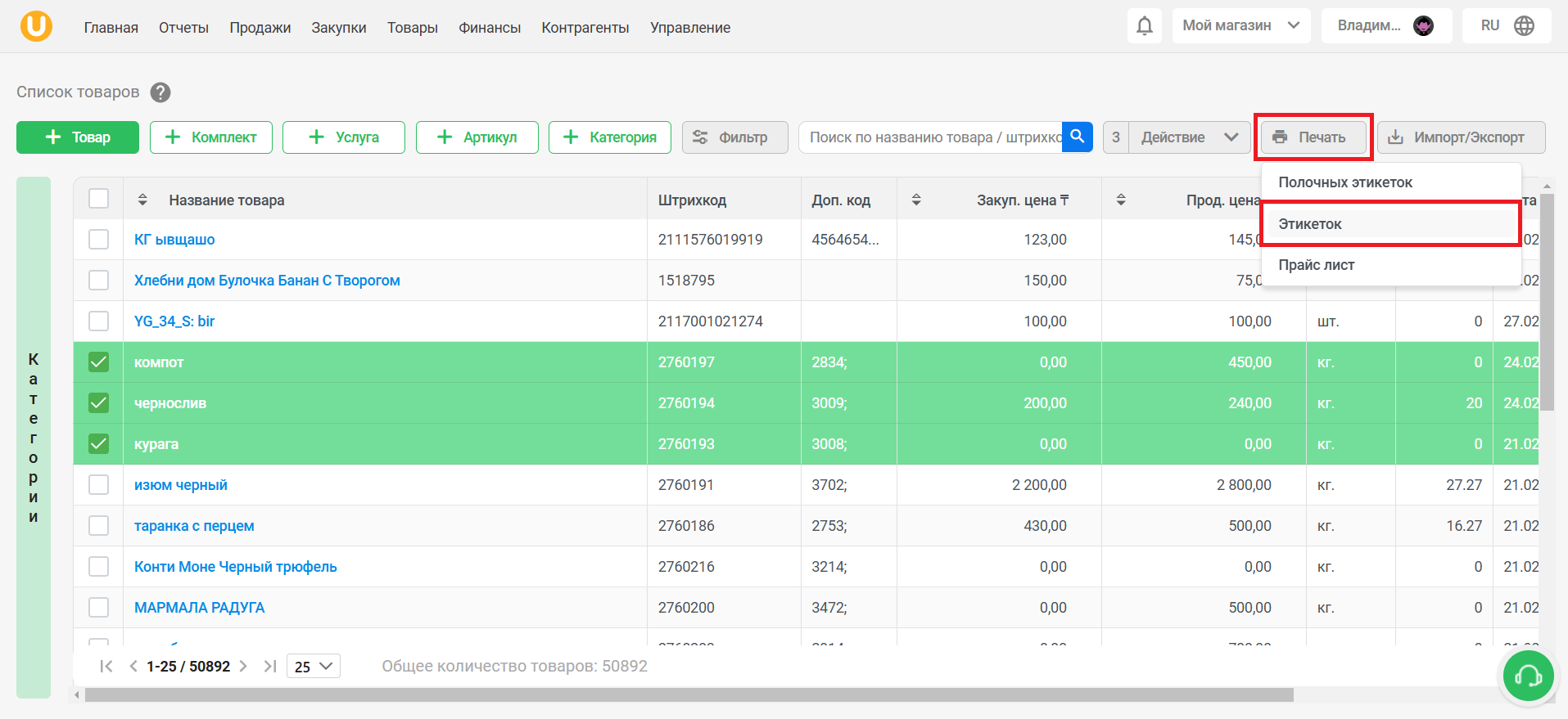 Для того, чтобы напечатать этикетку товара, выберите товар из списка товаров, затем нажмите на кнопку “Печать” и выберите пункт “Этикеток”. Откроется страница “Печать” с этикетками и ценниками для выбранных вами товаров.