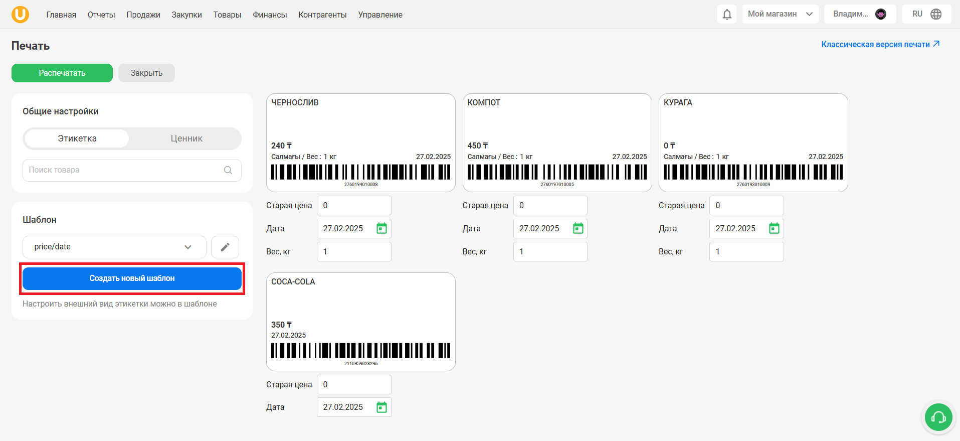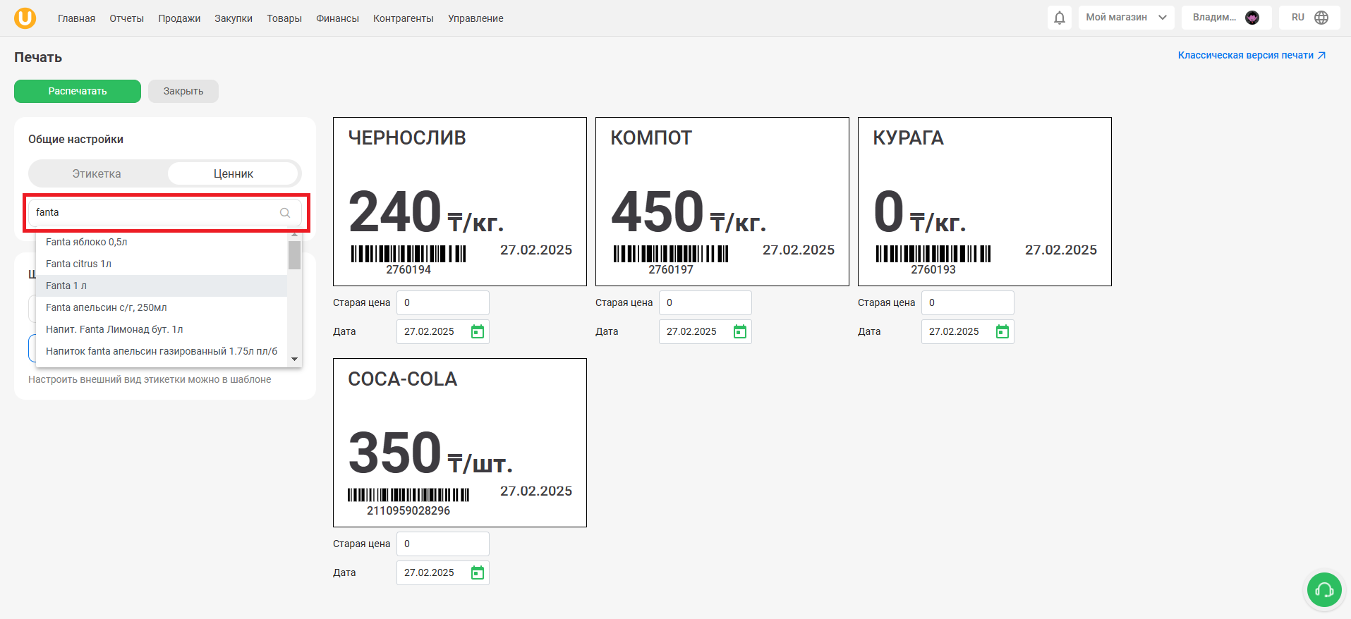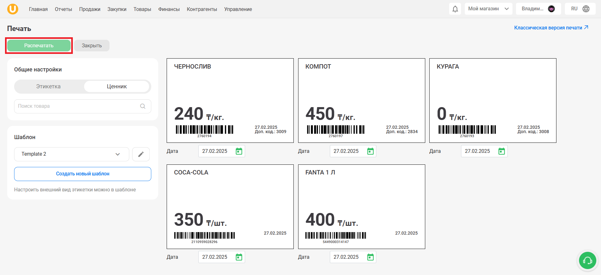 После внесения всех изменений, нажмите на кнопку “Распечатать” в левом верхнем углу экрана для печати ценников/этикеток.