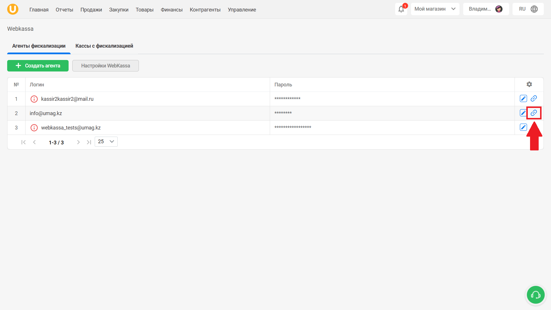 Во вкладке “Агенты фискализации” вы увидите таблицу с логинами и паролями созданных агентов фискализации. Нажмите на кнопку “📝” в правой части таблицы, чтобы отредактировать данные агента фискализации.