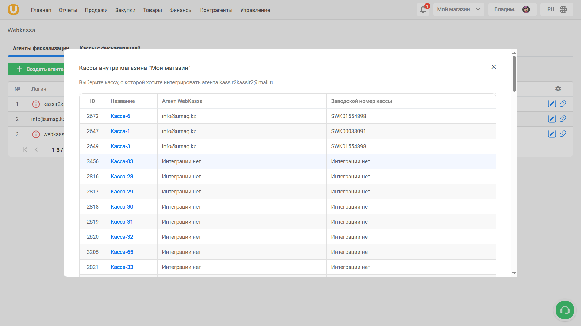 Далее, выберите кассу, с которой хотите интегрировать агента. Для выбора кассы, просто кликните на нужную строчку с кассой.
