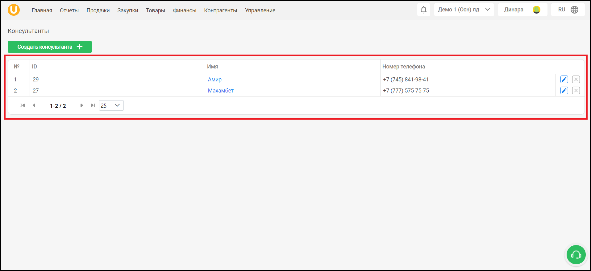 В списке вы можете увидеть ID, имя и номер телефона консультанта.