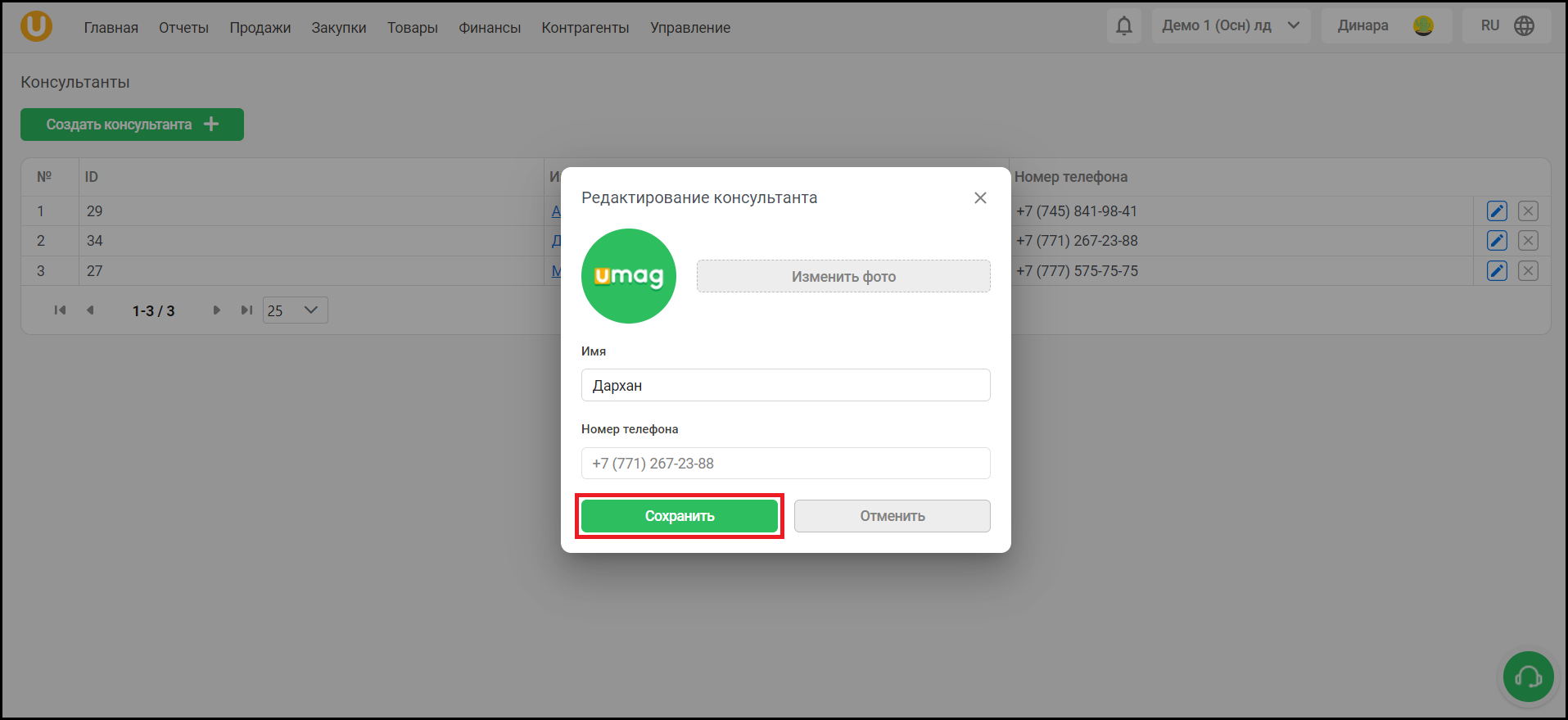 Откроется окно “Редактирование консультанта”. Внесите изменения и нажмите на кнопку “Сохранить”, чтобы сохранить редактирование.