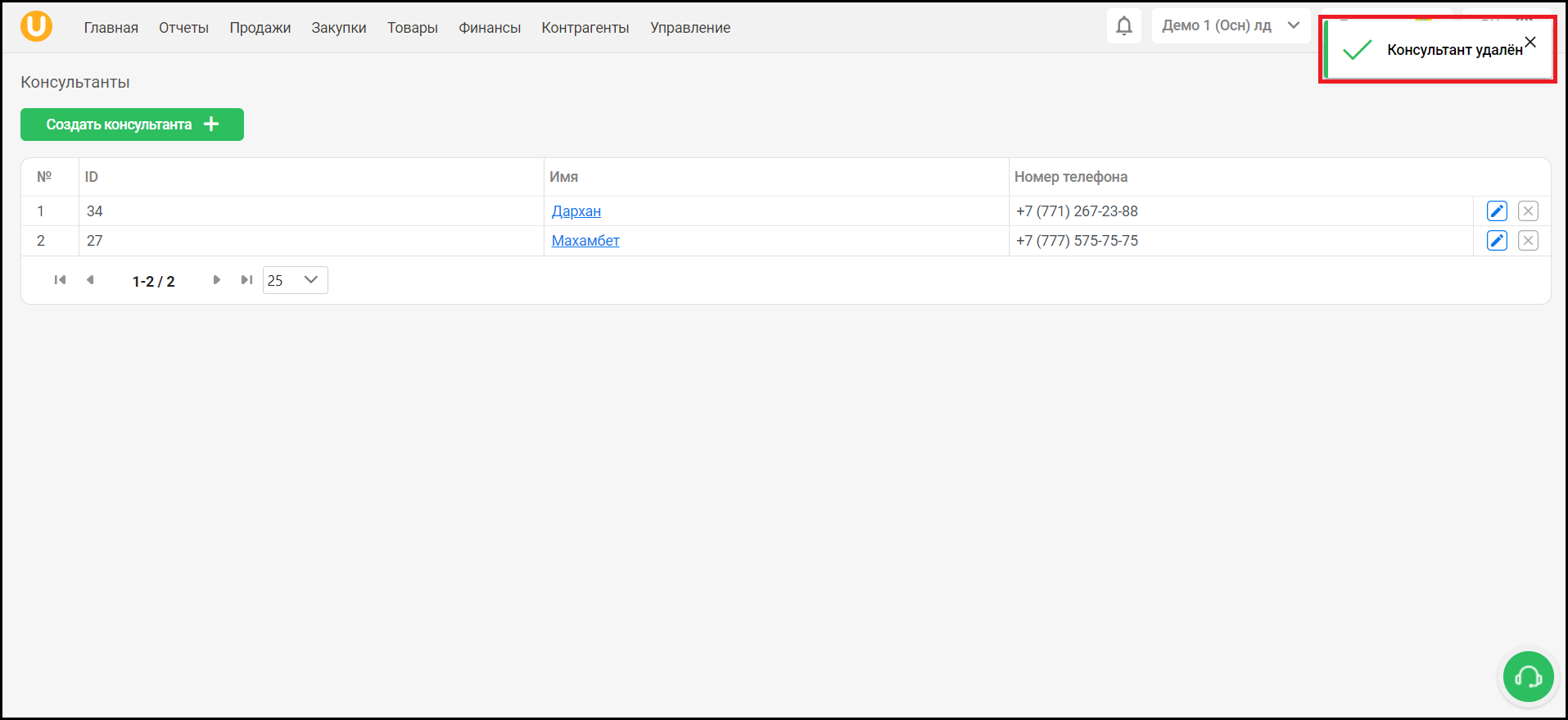 При успешном удалении консультант в списке исчезнет, а вы увидите уведомление в правом верхнем углу экрана.