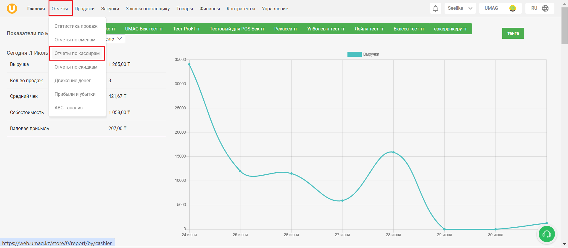 Чтобы перейти на страницу "Отчеты по кассирам", откройте вкладку "Отчеты" в верхнем меню, затем в выпадающем списке выберите строку "Отчеты по кассирам".