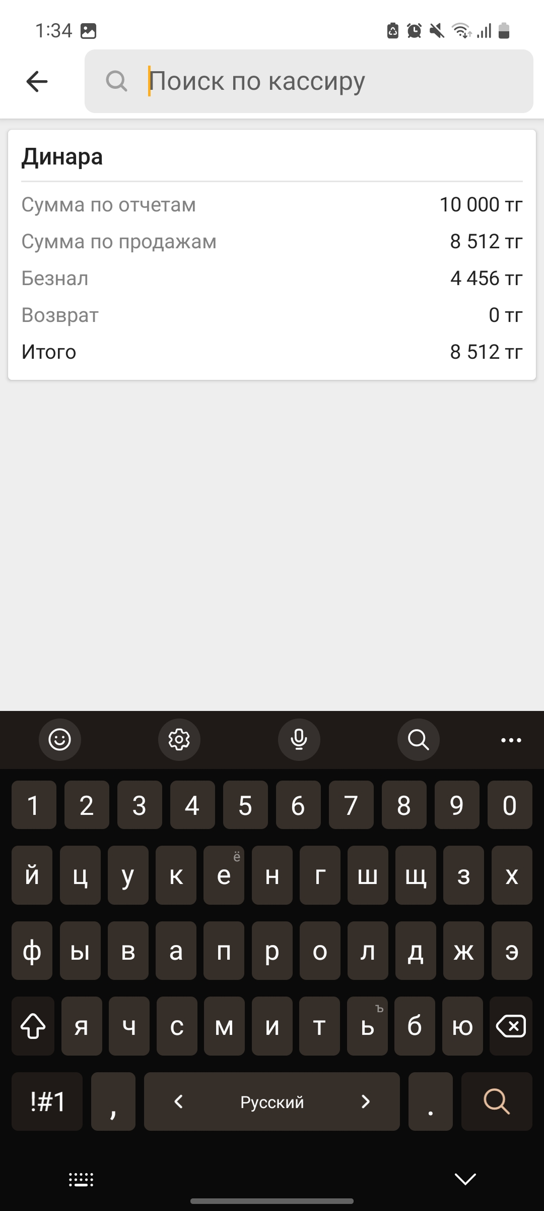 Вы также можете воспользоваться поиском по кассиру, для этого нажмите на иконку лупы в верхнем правом углу и введите Имя кассира.