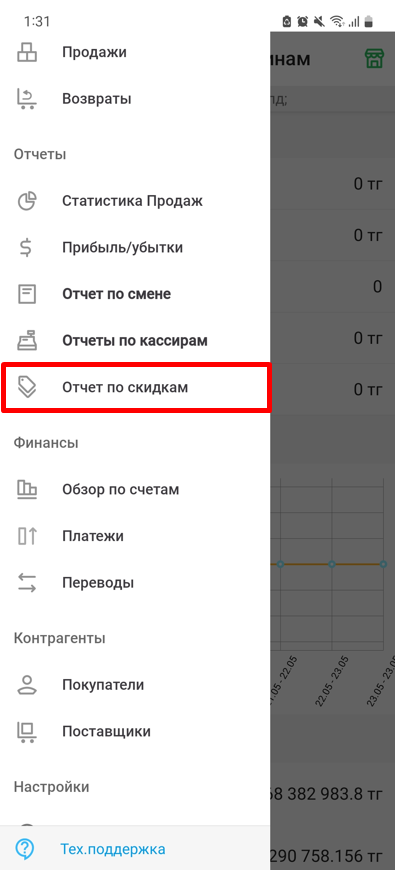 Чтобы перейти на страницу "Отчеты по скидкам", откройте боковое меню, затем в разделе "Отчеты" выберите строку "Отчеты по скидкам".
