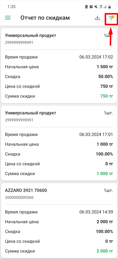 Перед вами появится список товаров продажа по которым проводилась с предоставлением скидок в вашей торговой точке за определенный период. Отчет по скидкам представлен в табличном виде с следующими столбцами: