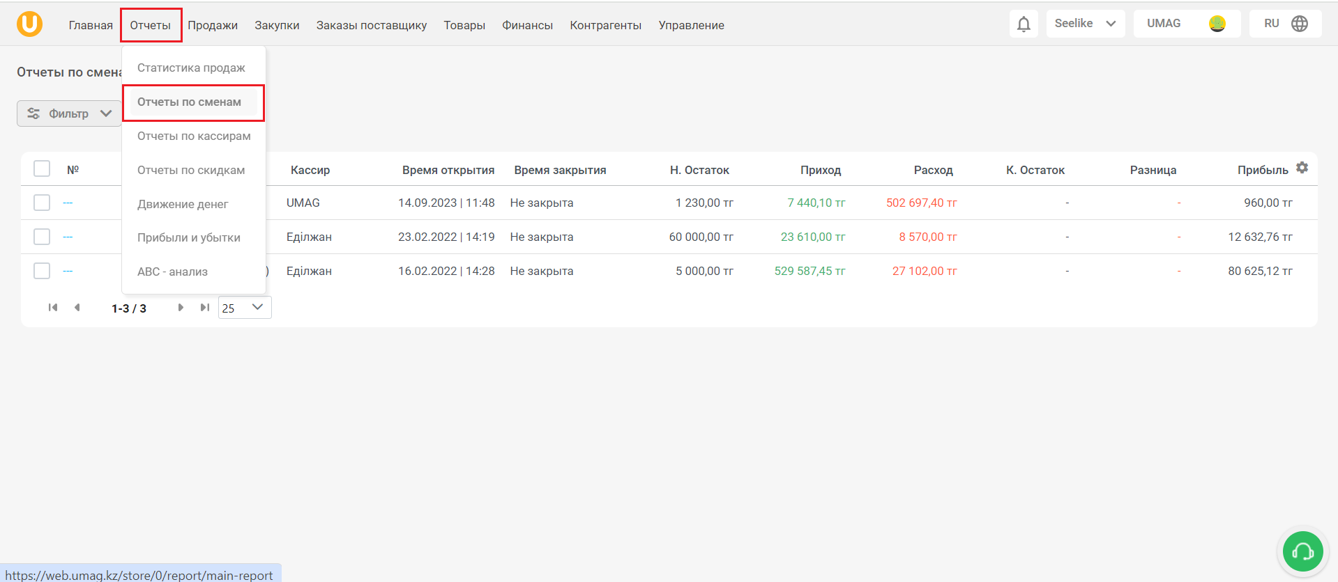Чтобы перейти на страницу "Отчеты по сменам", откройте боковое меню, затем в разделе "Отчеты" выберите строку "Отчеты по сменам".