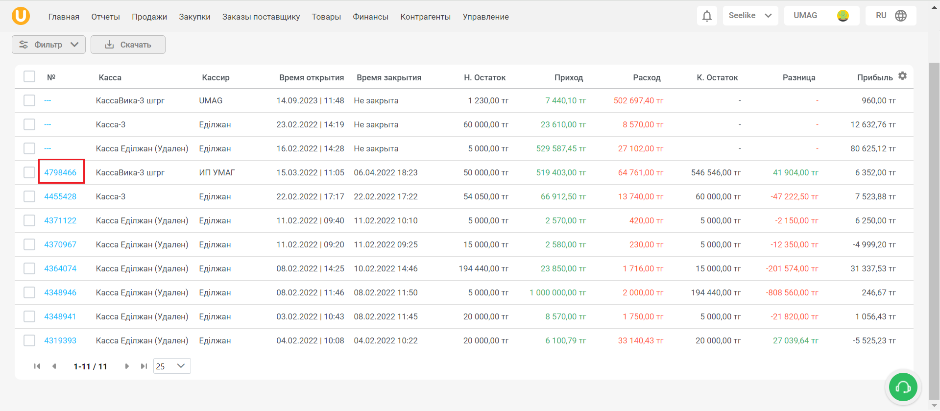 Для просмотра детального отчета по смене нажмите на уникальный номер смены в первом столбце.