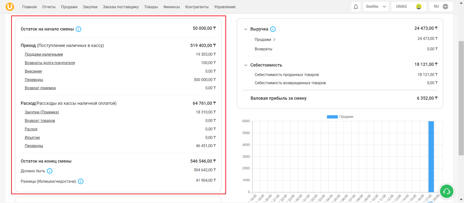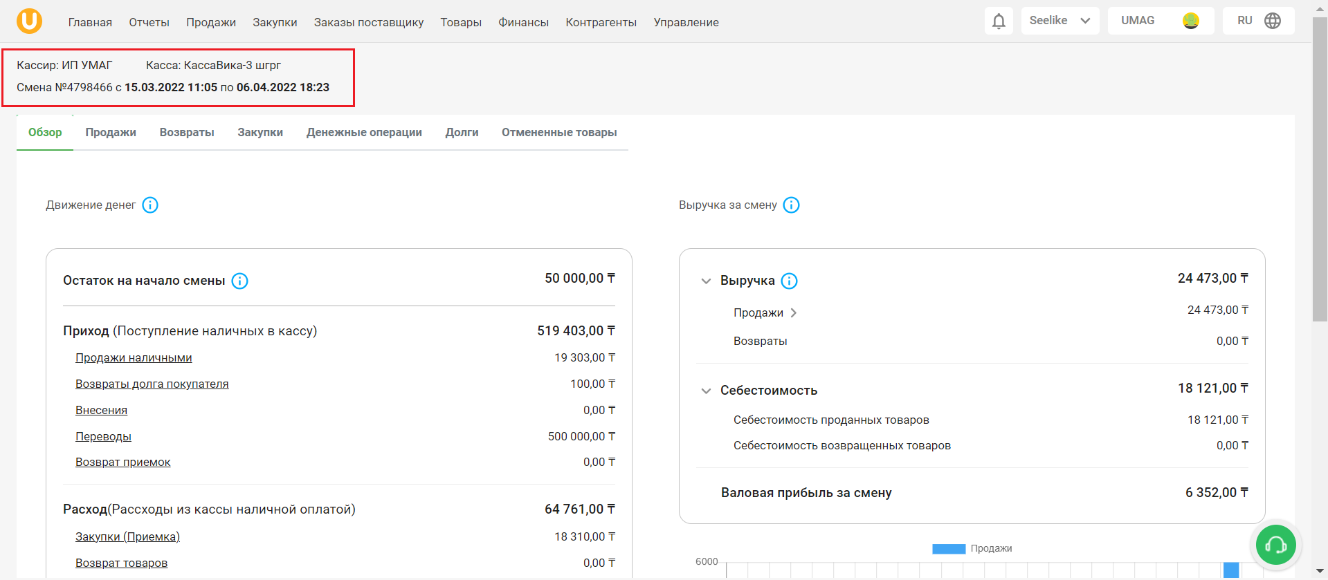 После чего перед вами откроется страница с общей информацией за смену. В верхней части будет указан выбранный кассир, касса, а также дата и время начала смены.