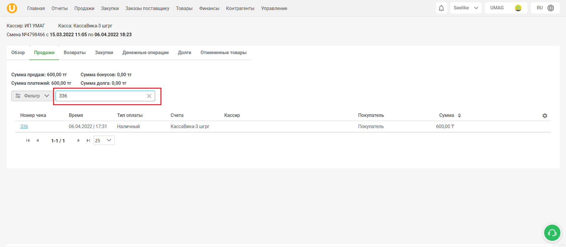 Этот раздел предоставляет информацию о продажах за смену. Перед вами появится список чеков продажи за смену. В списке уникальный номер чека, дата и время продажи, способ оплаты и покупатель.
