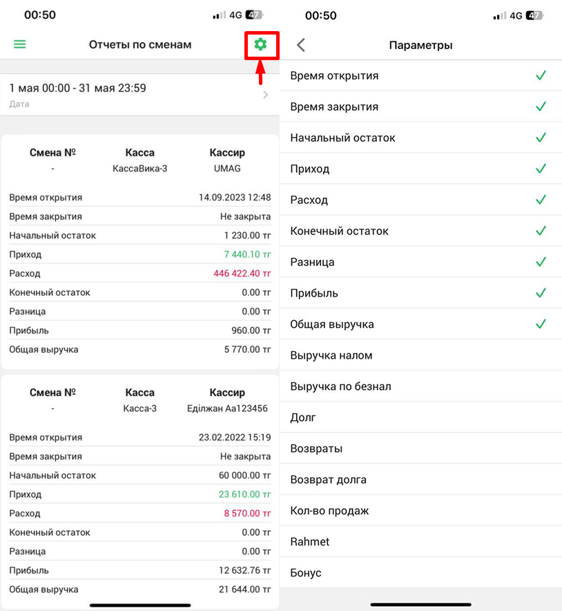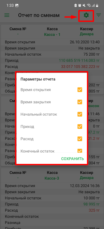 Чтобы задать параметры отображения отчетов нажмите на иконку шестеренки в правом верхнем углу экрана, затем в открывшемся окне выберите какие данные должны отображаться и поставьте или уберите галочку рядом с ними, после чего нажмите на кнопку “Сохранить”