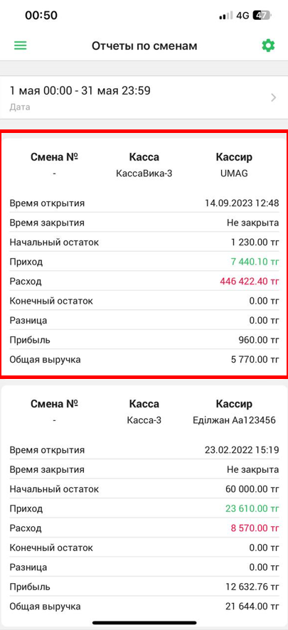 Перед вами список смен в вашей торговой точке за определенный период. Отчет представлен в блочном виде со следующими данными: название кассы, имя кассира, время открытия и закрытия смены, начальный остаток денег на кассе, приход (сумма денег, поступивших за смену), расход (сумма денег, израсходованных за смену), конечный остаток денег на кассе, разница между начальным и конечным остатком, и прибыль за смену.