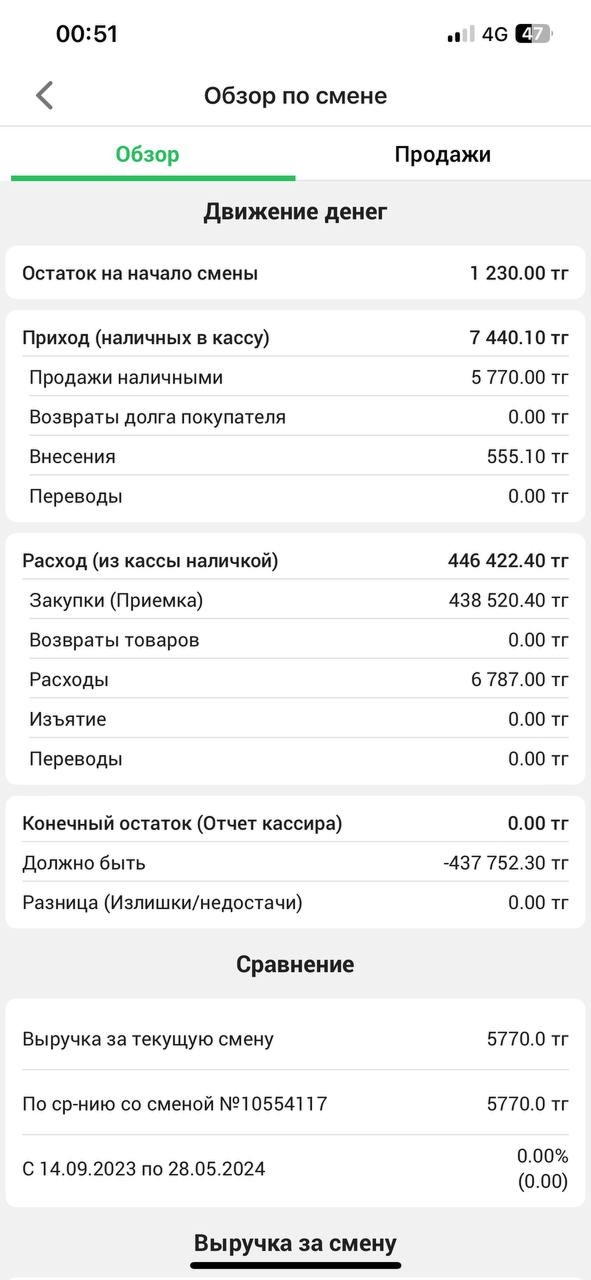 После чего перед вами откроется страница с общей информацией за смену. В верхней части данной страницы вы можете переключать по следующим вкладкам: “Обзор”, “Продажи”, “Возвраты”, “Закупки”, “Денежные операции”, “Долги”, “Отмененные товары”.