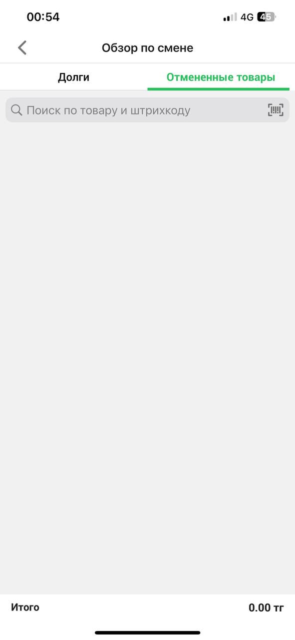 На этой вкладке представлена информация по всем отмененным товарам за смену, то есть по товарам, которые были отсканированы или добавлены иным способом, но не были проданы и были удалены из списка продажи.