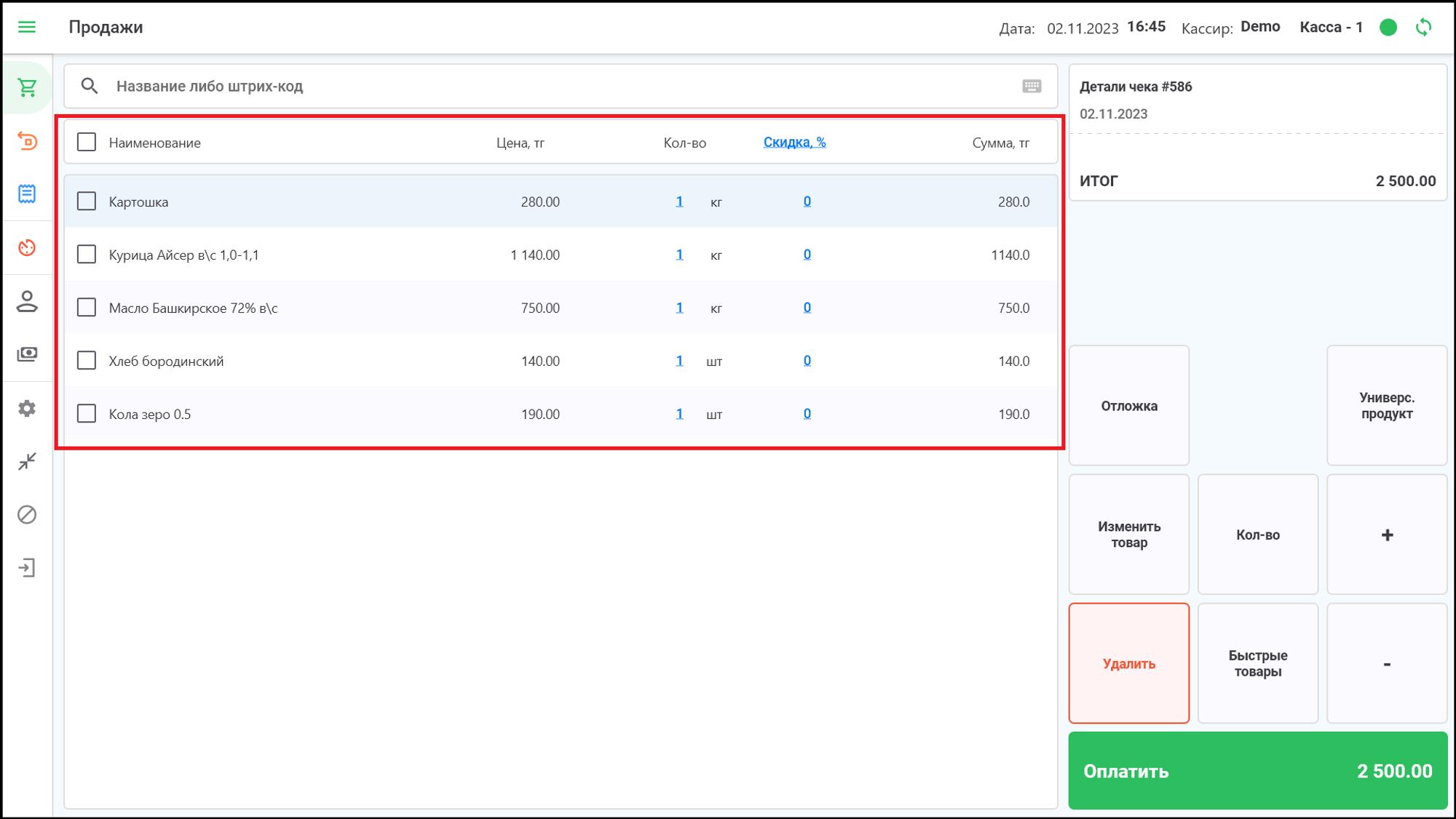 После добавления товаров на кассе, вы увидите их в корзине. Таблица состоит из наименования, цены, количества, скидки и суммы товаров.