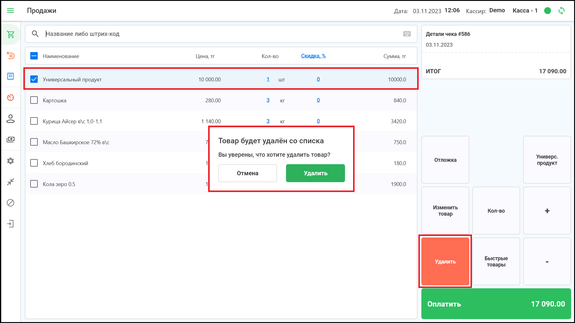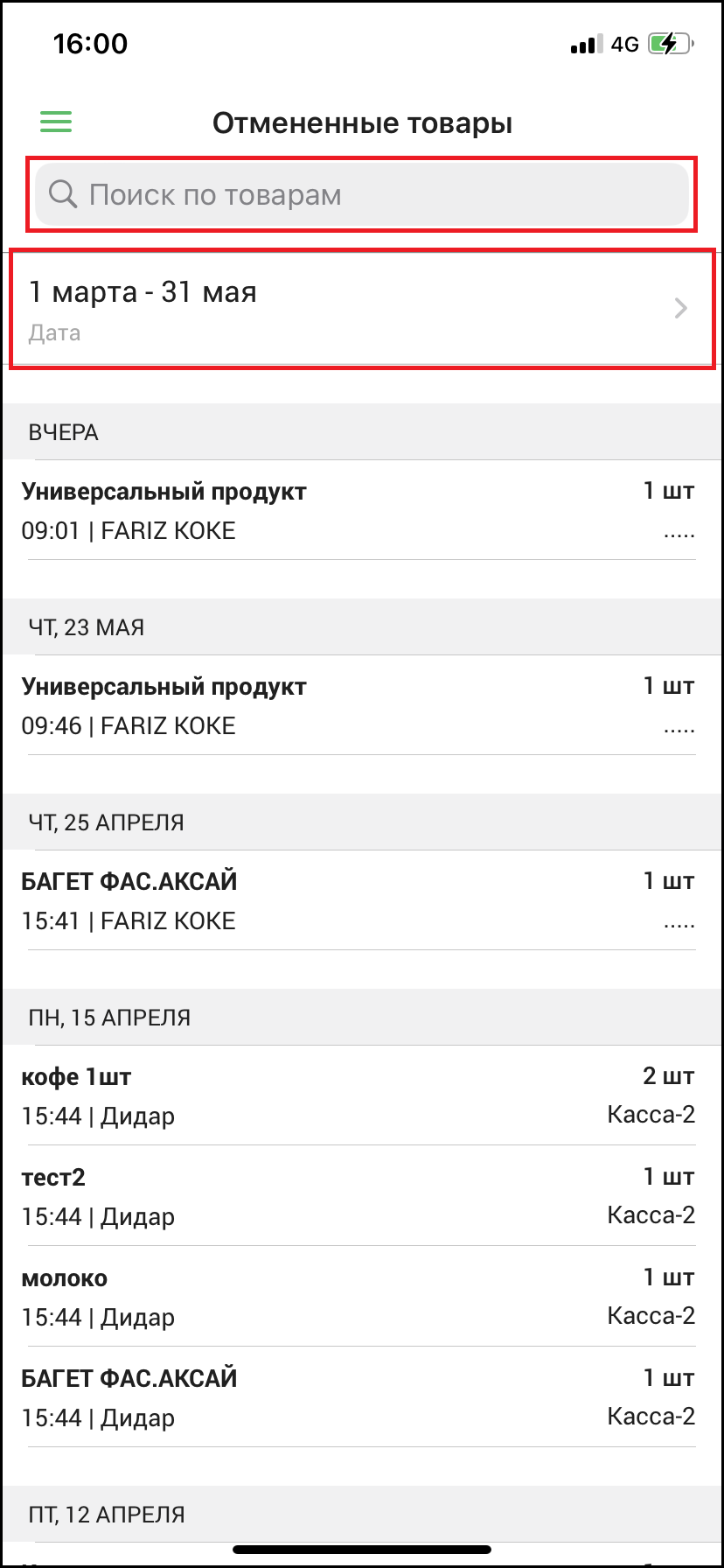 При удалении товара из списка продаж на кассе, товар появится в разделе “Отмененные товары” после синхронизации кассы с базой данных.