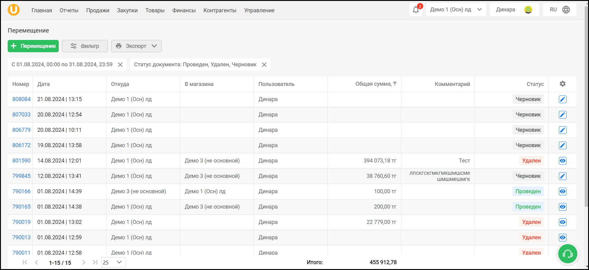 Откроется страница “Перемещение”. На этой странице вы можете увидеть информацию о проведенных перемещениях, фильтр и кнопку создания перемещения. В списке вы можете увидеть информацию о перемещениях: дату и время перемещения, сумму, путь перемещения, а также кем было совершено перемещение.