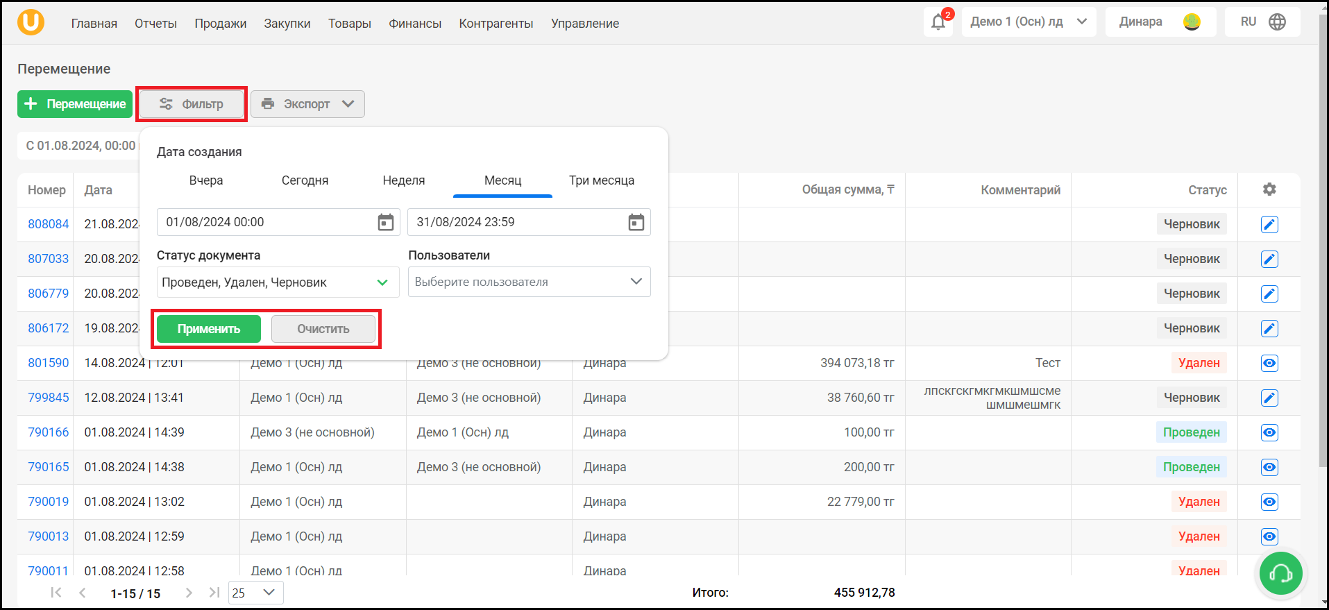 Нажмите на кнопку “Фильтр”, чтобы отфильтровать перемещения в списке перемещений. Выставив необходимые параметры фильтра, нажмите на кнопку “Применить” для применения фильтрации, либо “Очистить”, чтобы отменить фильтрацию.