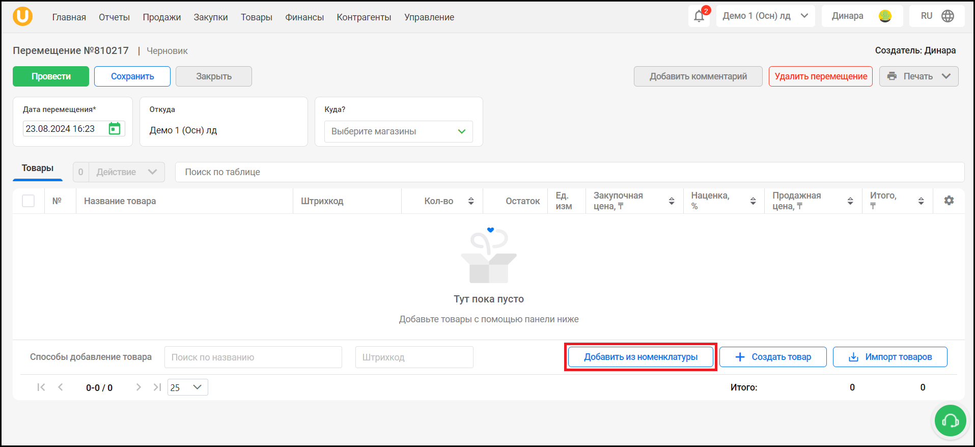 Для того, чтобы добавить товары в перемещение из номенклатуры, нажмите на кнопку “Добавить из номенклатуры” во вкладке “Товары”.