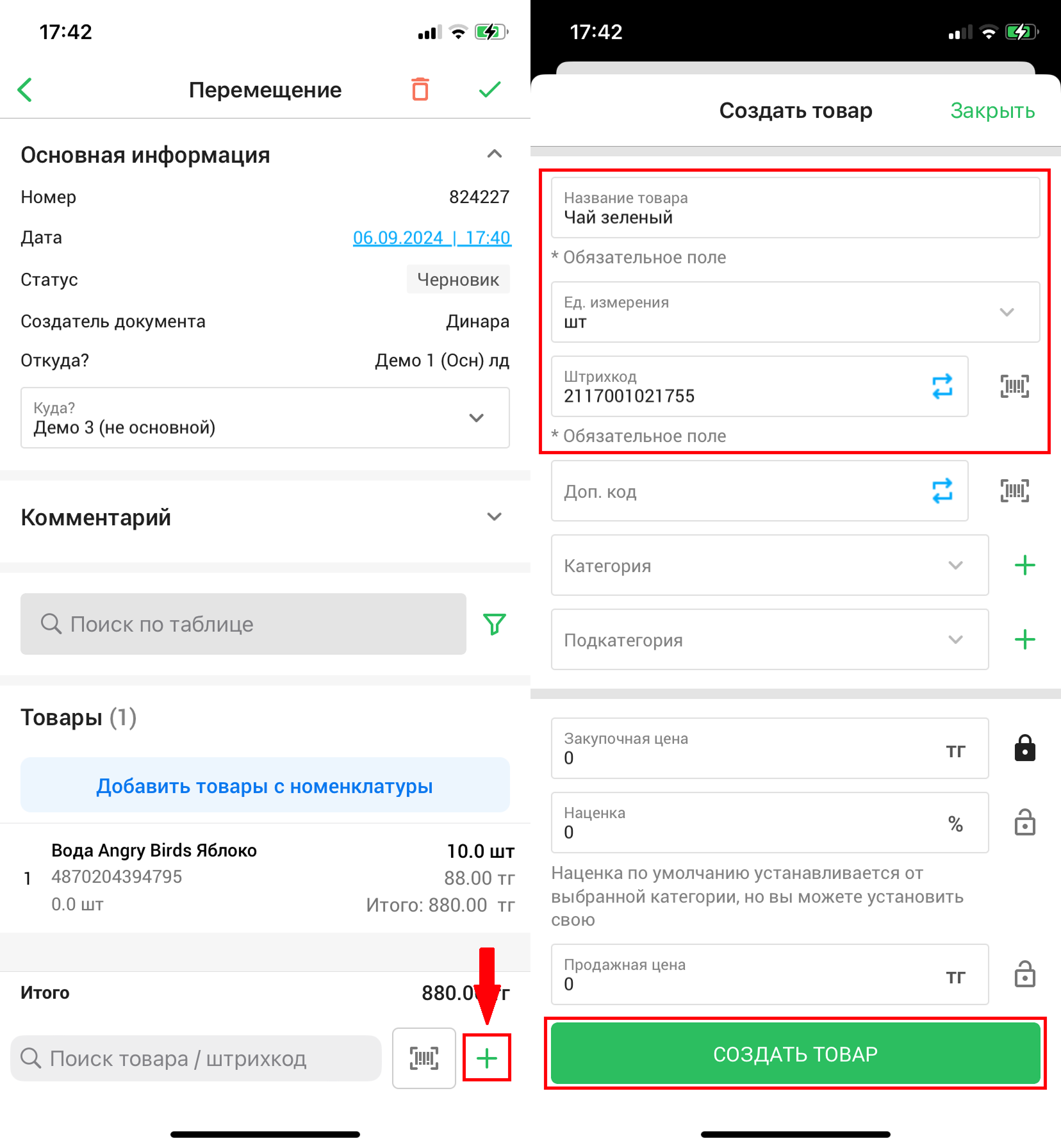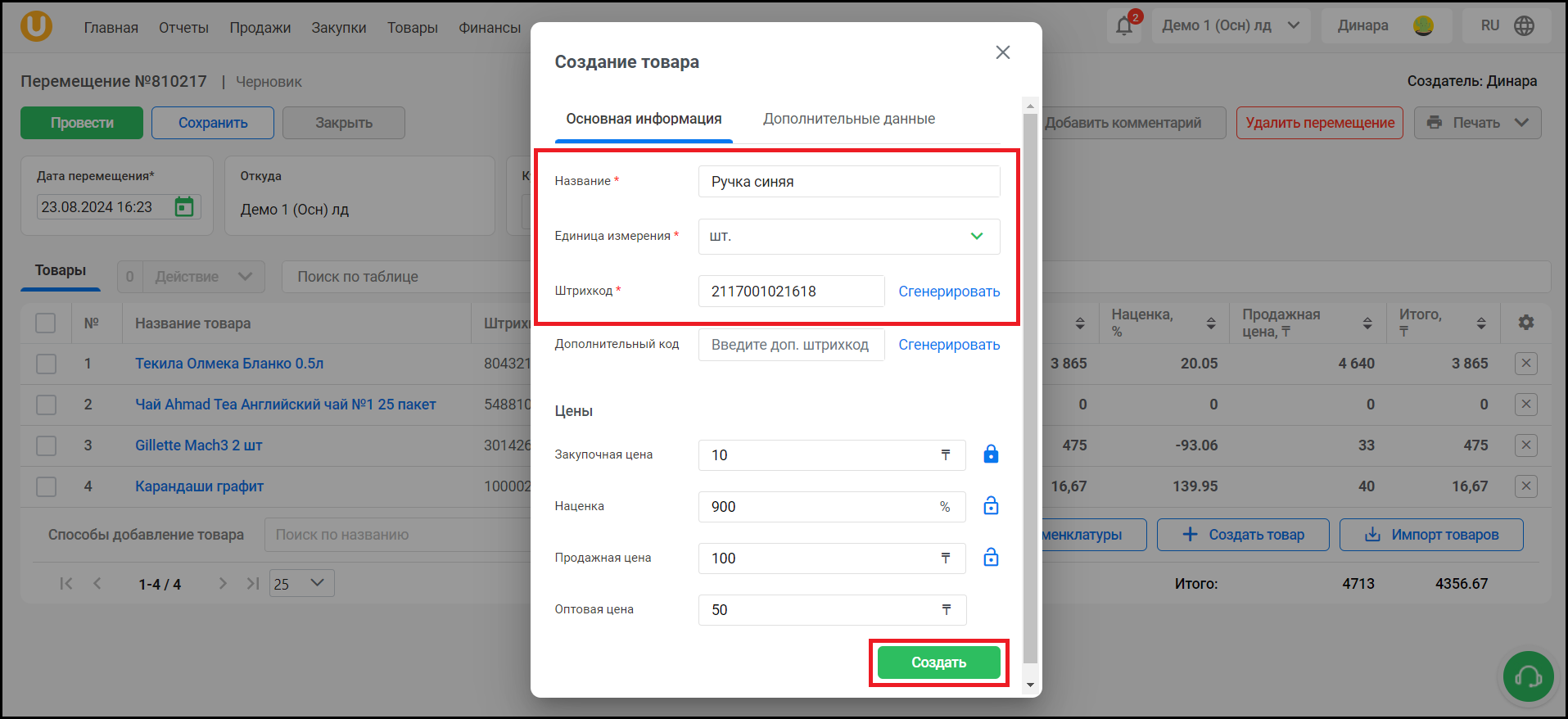 Откроется окно “Создание товара”. Заполните все обязательные поля и нажмите на кнопку “Создать”, чтобы создать товар и добавить его в перемещение.