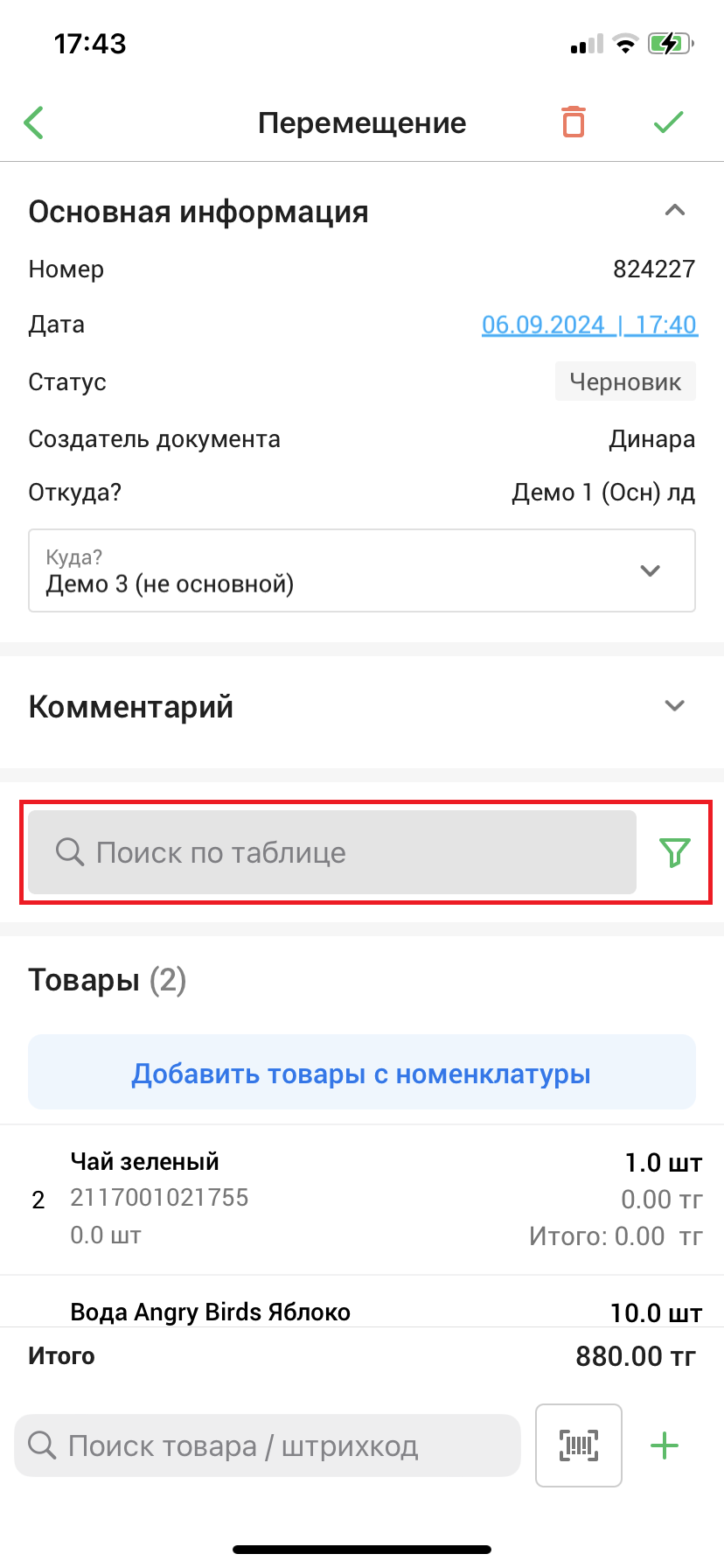 Воспользуйтесь поиском по таблице и фильтром товаров, добавленных в документ для удобства поиска.