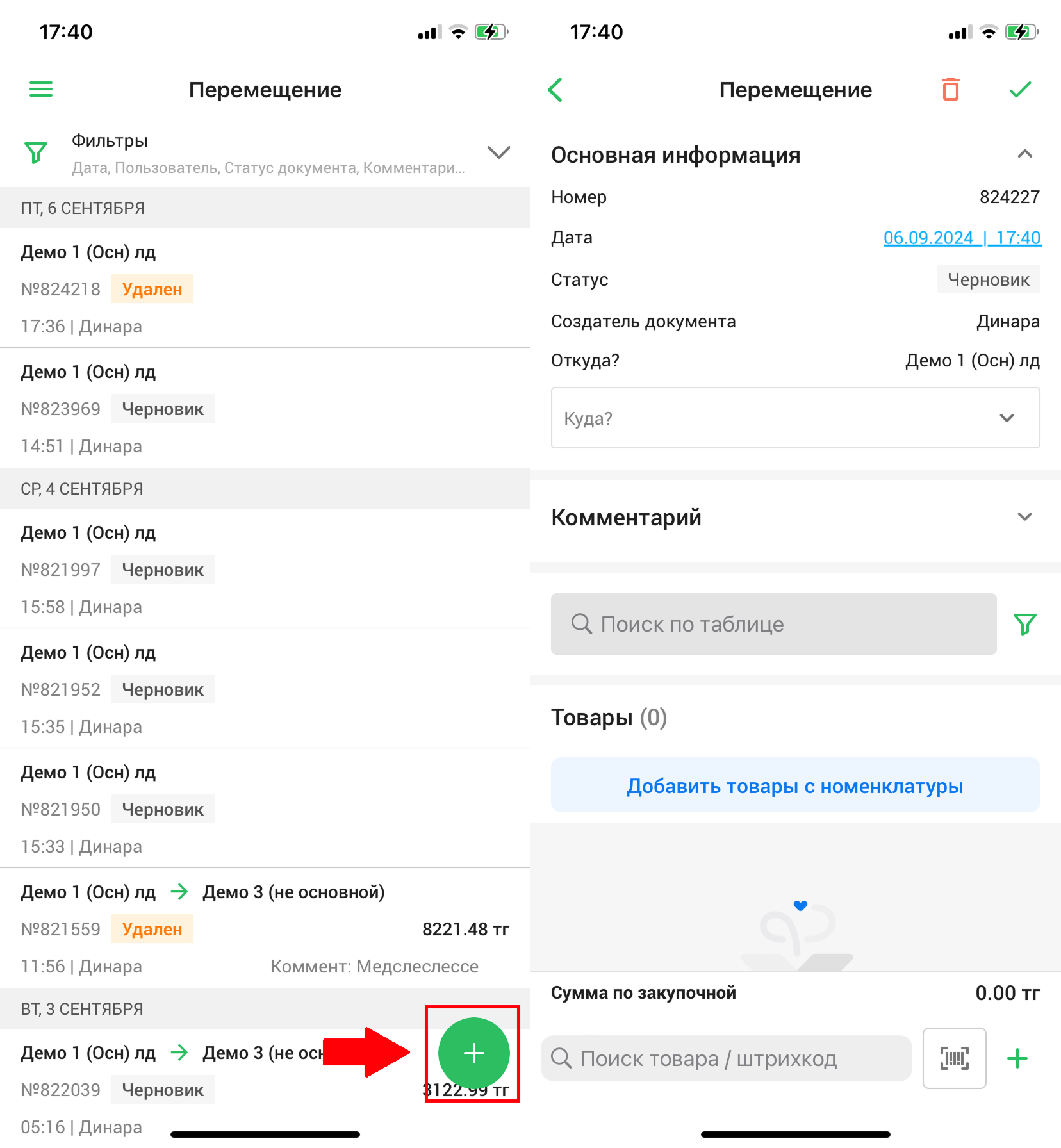 Для того, чтобы перейти в раздел “Перемещение”, откройте боковое меню, нажав на кнопку “≡”, дальше в боковом меню перейдите в раздел “Товары” → “Перемещение”