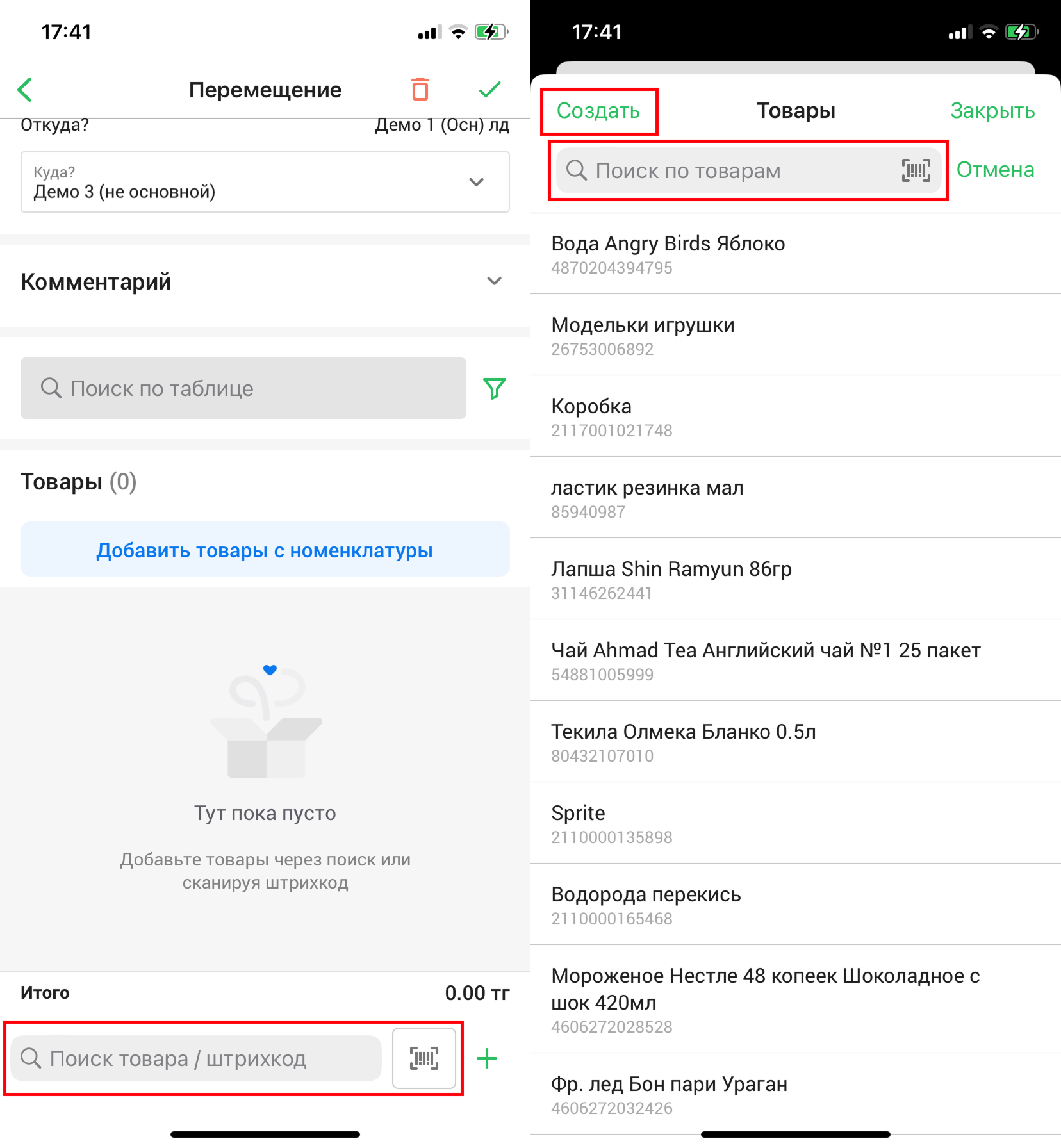 Для того, чтобы выбрать товары, которые будут перемещены, нажмите на поле “Поиск товара / штрихкод”, чтобы совершить поиск товара по названию или штрихкоду, либо нажмите на кнопку сканирования штрихкода, чтобы отсканировать штрихкод перемещаемого товара. При нажатии на поле “Поиск товара / штрихкод”, откроется окно “Товары”. Выберите товар из списка, либо нажмите на кнопку “➕” в правом нижнем углу, чтобы создать новый товар. Воспользуйтесь поиском по товарам для удобства.