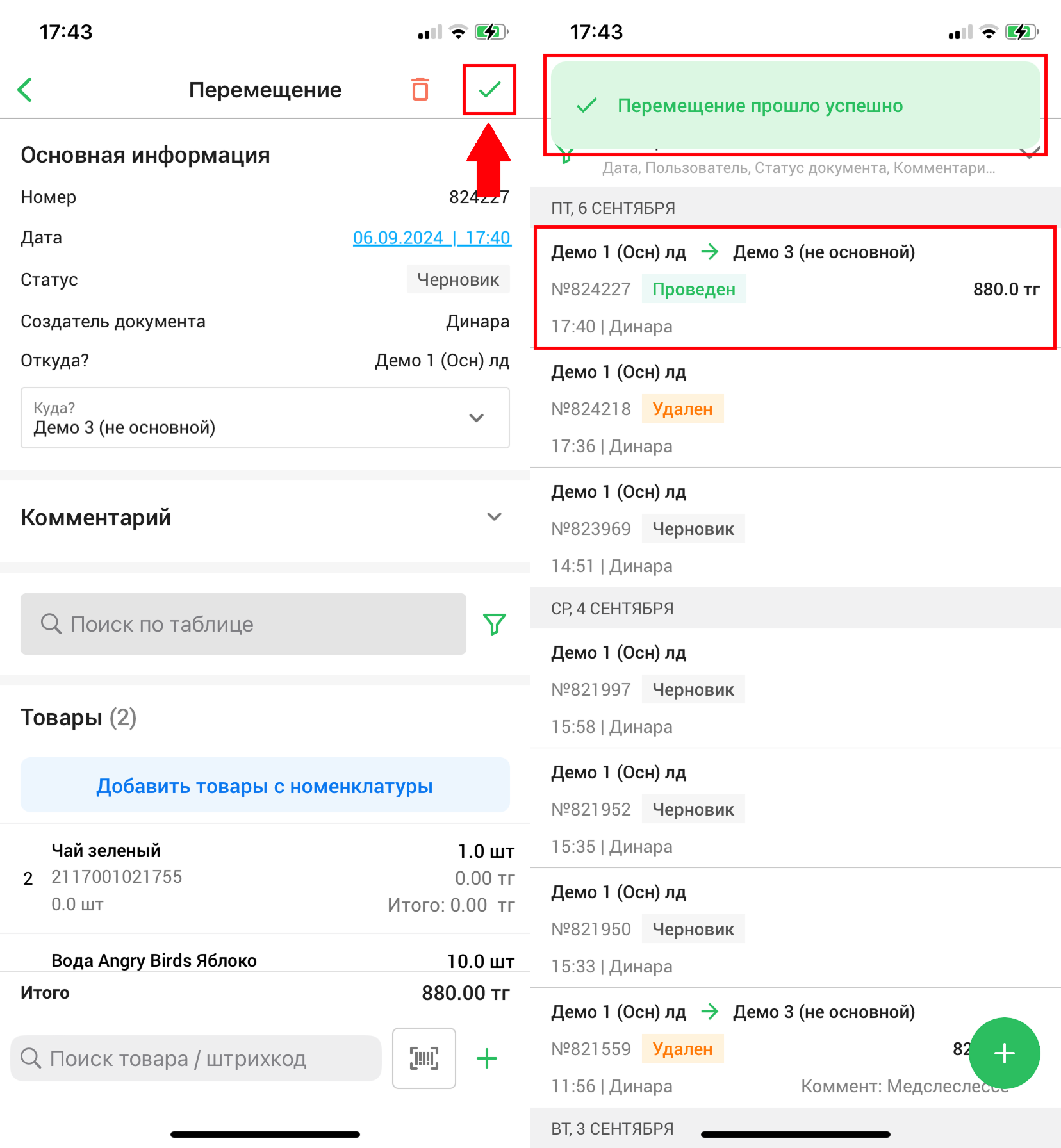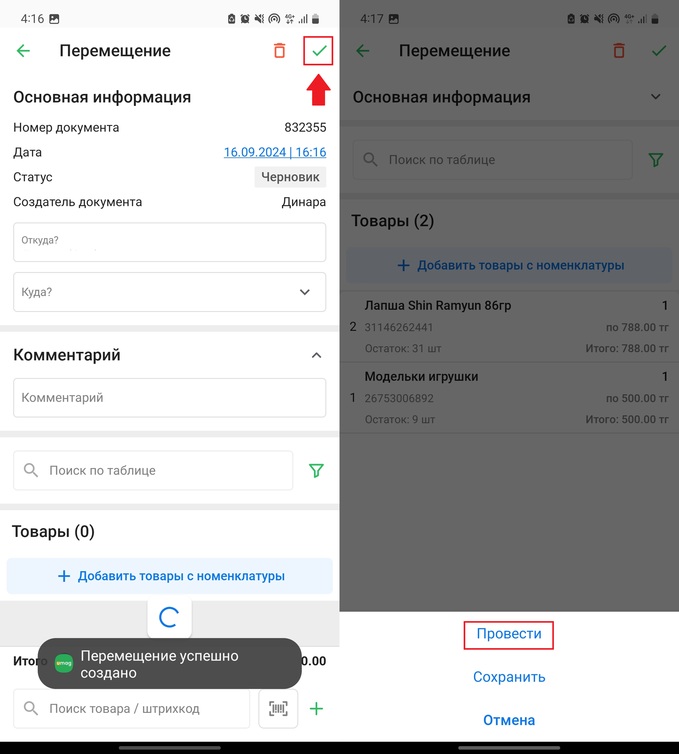 После того, как вы заполните необходимую информацию о перемещении, нажмите на кнопку “✅” в правом верхнем углу экрана, чтобы создать перемещение. В открывшемся окне нажмите на кнопку “Провести”. Готово! При успешном создании перемещения, вы увидите его в списке перемещений, а также отобразится уведомление “✅Перемещение успешно создано”.
