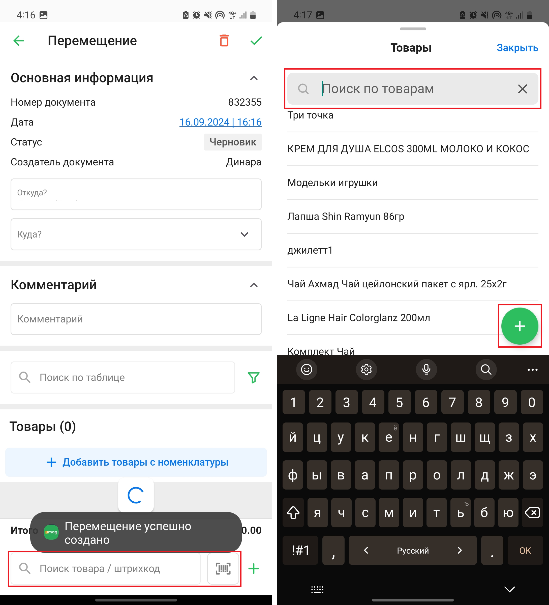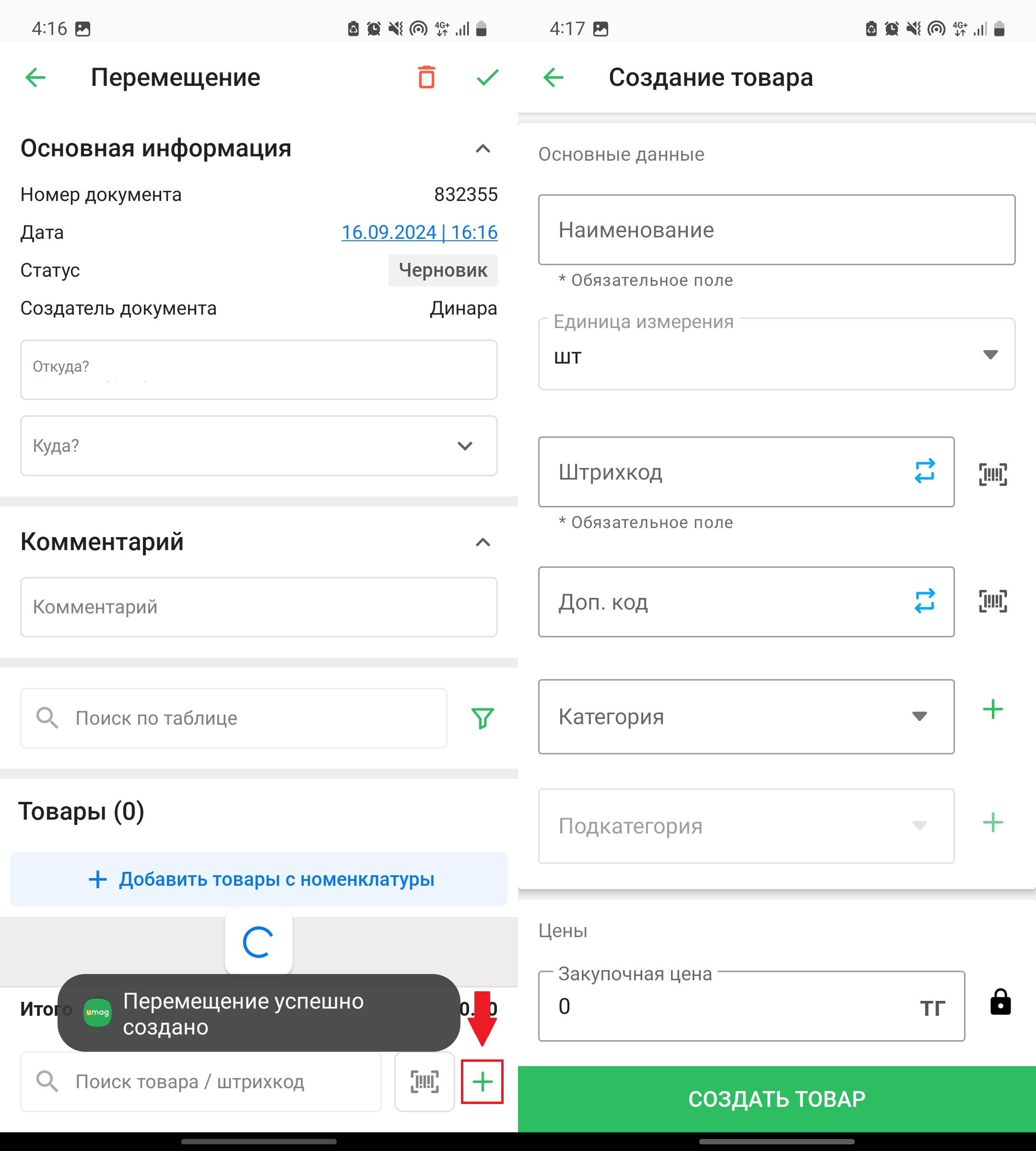 Нажмите на кнопку “➕Создать товар”, чтобы создать новый товар и добавить его в перемещение.