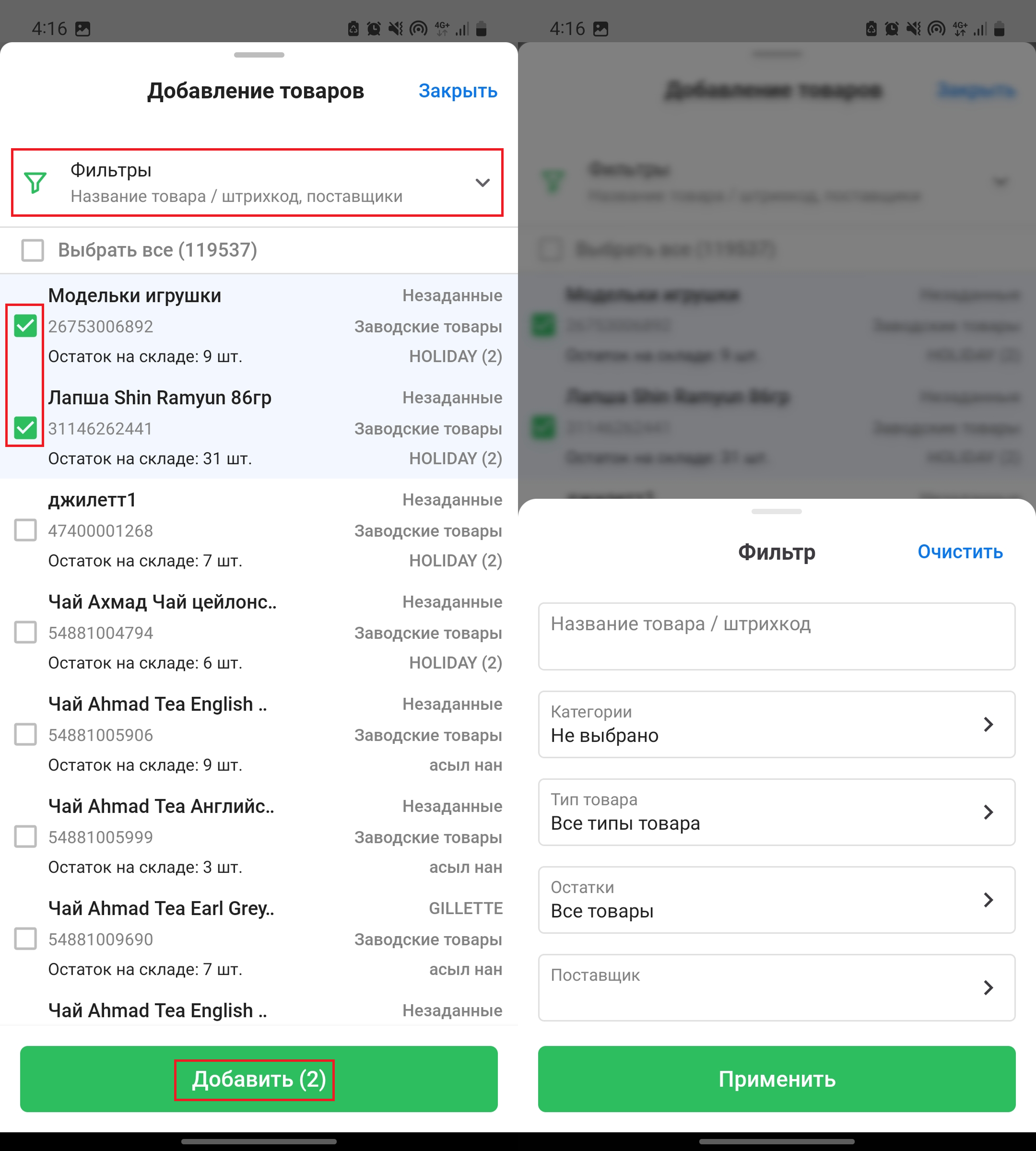 Добавленные товары вы увидите в списке, в котором вы можете отредактировать количество. Нажмите на кнопку “❌” напротив товара, чтобы удалить его из списка.