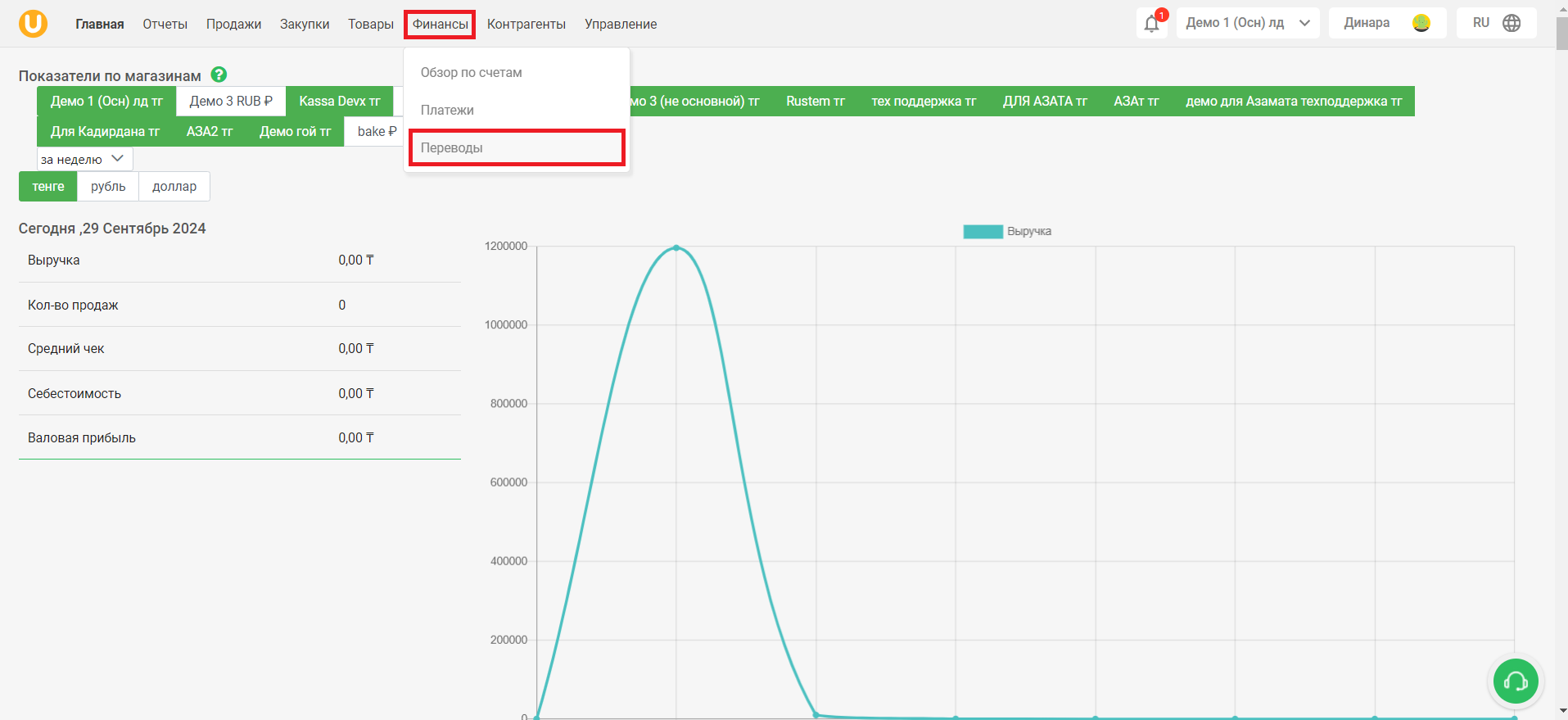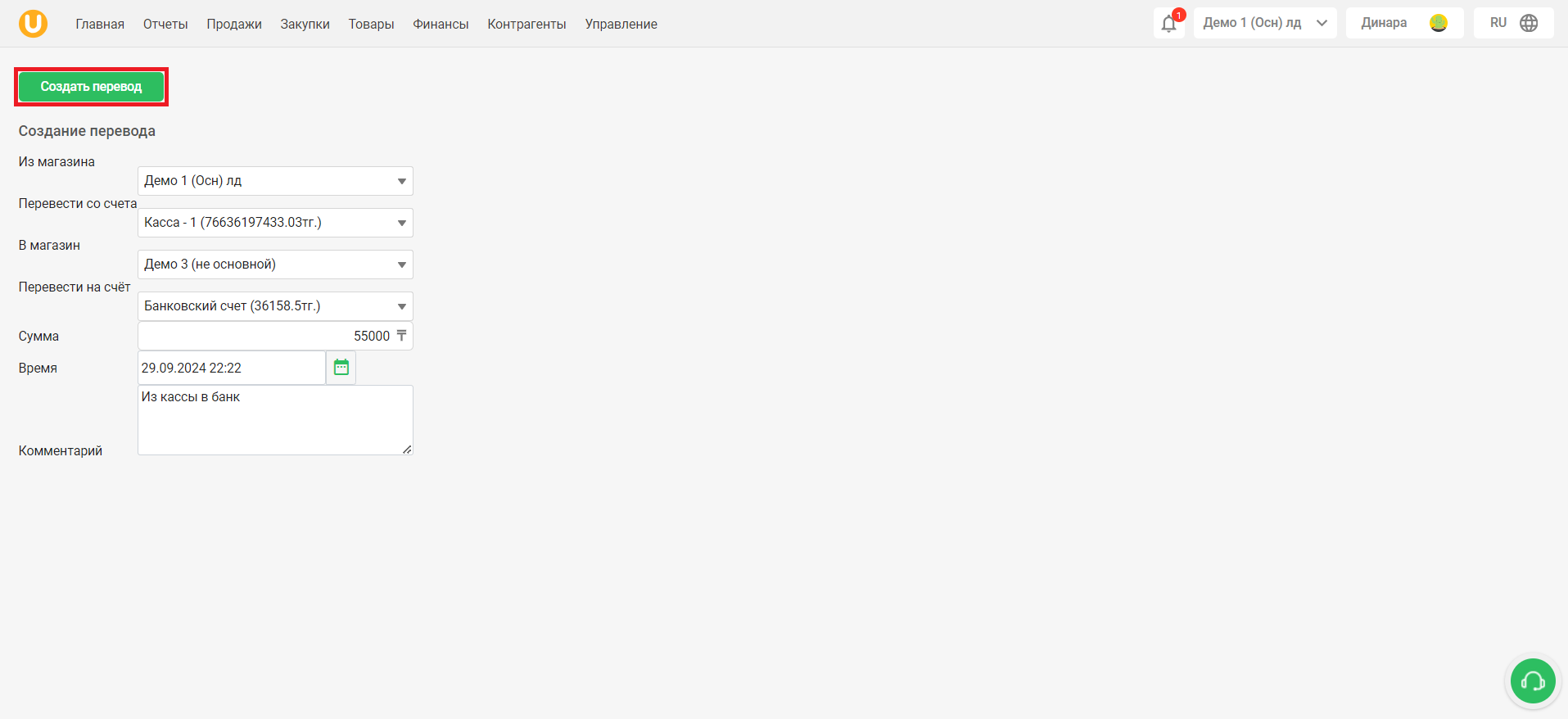 Откроется страница “Создание перевода”. Заполните необходимые данные - из какого магазина, из какого счета будет совершен перевод, в какой магазин, на какой счет поступят средства. Введите сумму перевода, а также время перевода. При необходимости, вы можете оставить комментарий в поле “Комментарий”. После заполнения всех данных, нажмите на кнопку “Создать перевод”, чтобы создать перевод.