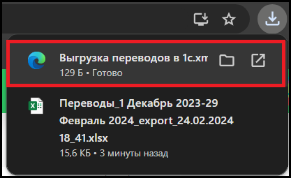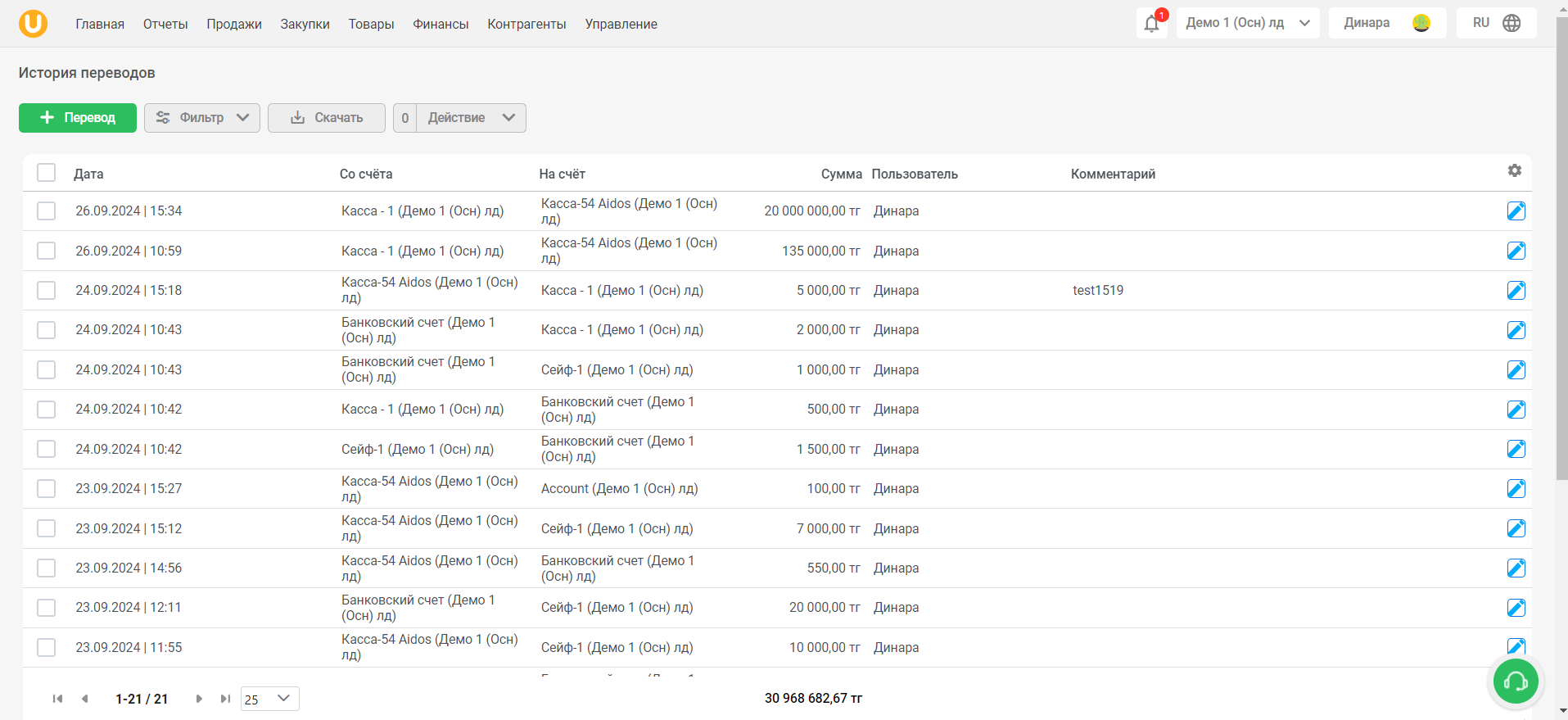 Откроется страница “История переводов”. На этой странице вы можете увидеть список совершенных переводов между счетами с подробной информацией - дата перевода, с какого счета и на какой счет был совершен перевод, на какую сумму был совершен перевод, пользователь, совершивший перевод, а также комментарий к переводу. Также, вы можете создать новый перевод, использовать фильтры, скачать данные и выгрузить их в 1С.