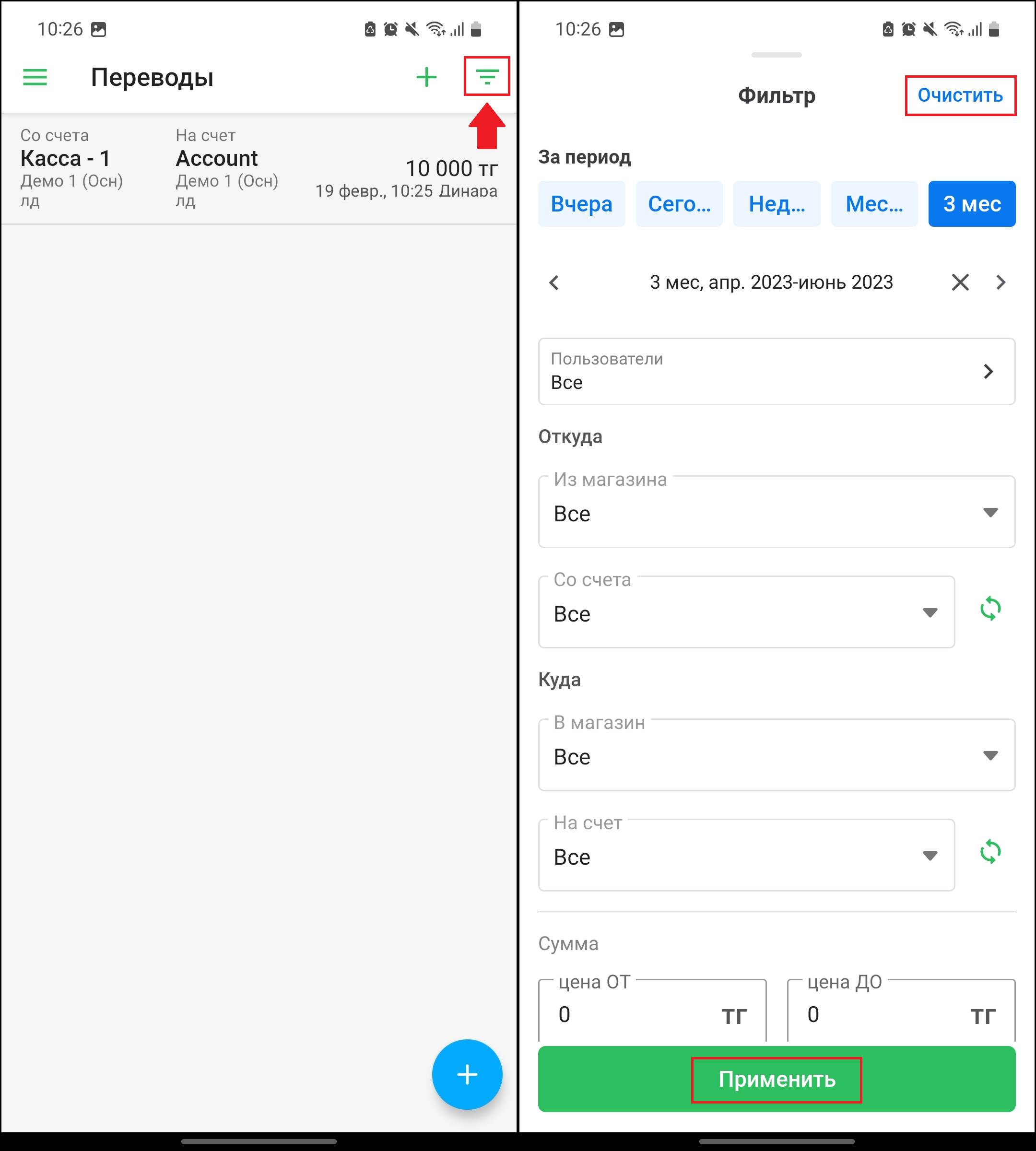Нажмите на поле фильтра в верхней части экрана, чтобы отфильтровать список так, как вам удобно. Нажмите на кнопку “Применить”, чтобы применить фильтр, либо нажмите на кнопку “Очистить”, чтобы очистить фильтр.