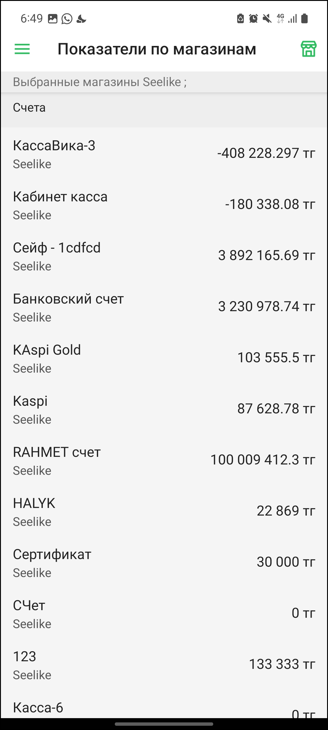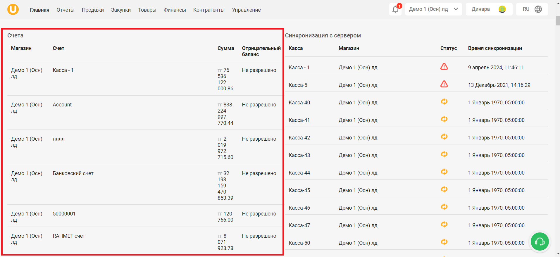 Спустив страницу ниже, в таблице “Счета” вы увидите информацию о счетах - к какомумагазину привязан счет, название счета, сумма на счете и разрешен ли отрицательныйбаланс.