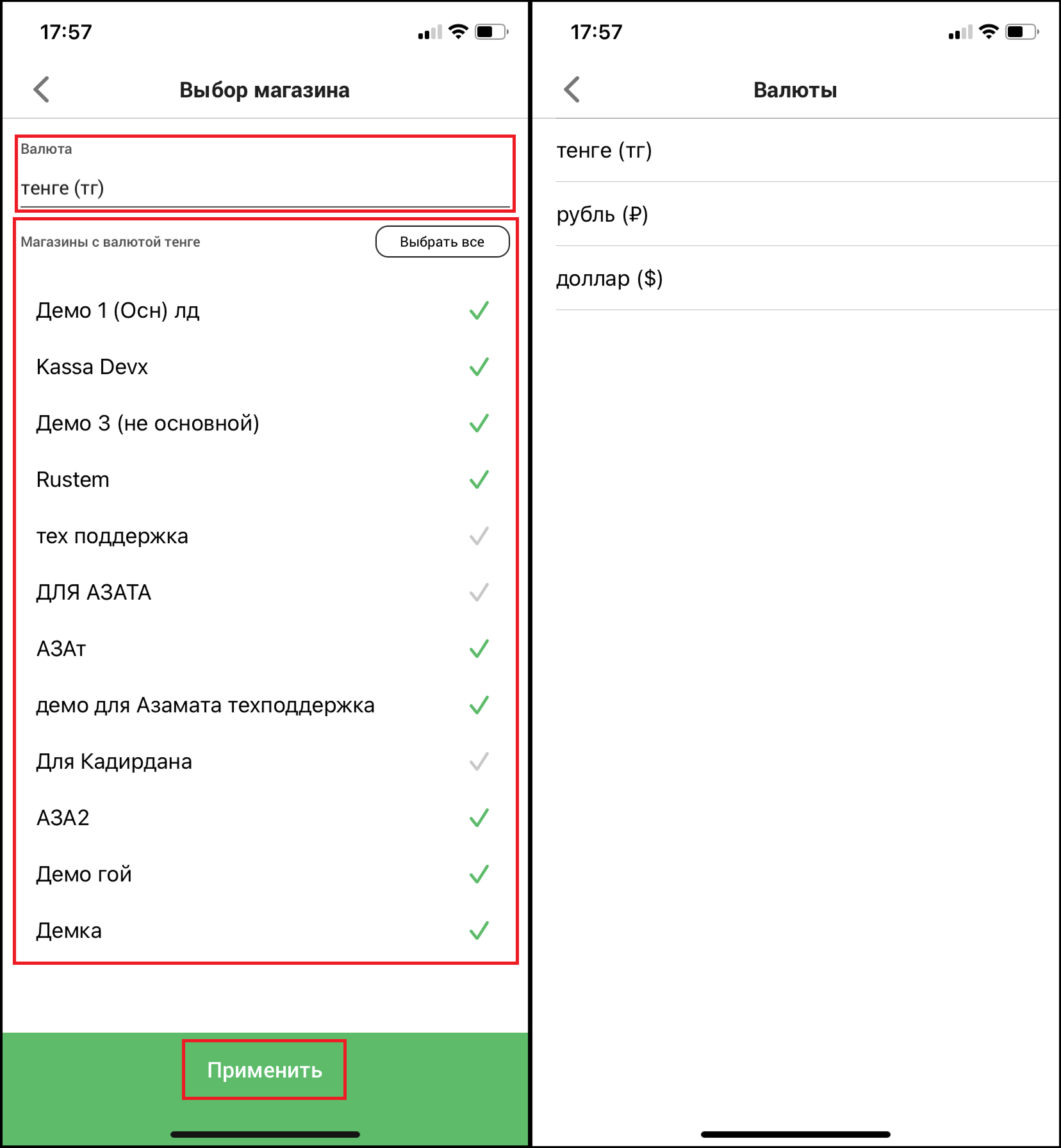 Откроется страница “Выбор магазина”. Выберите валюту из списка в верхней части страницы, чтобы вывести на экран магазины с данной валютой. Вы можете выбрать несколько торговых точек, отметив их галочкой “✅”.Затем, нажмите на кнопку “Применить” в нижней части страницы, чтобы вывести статистику.