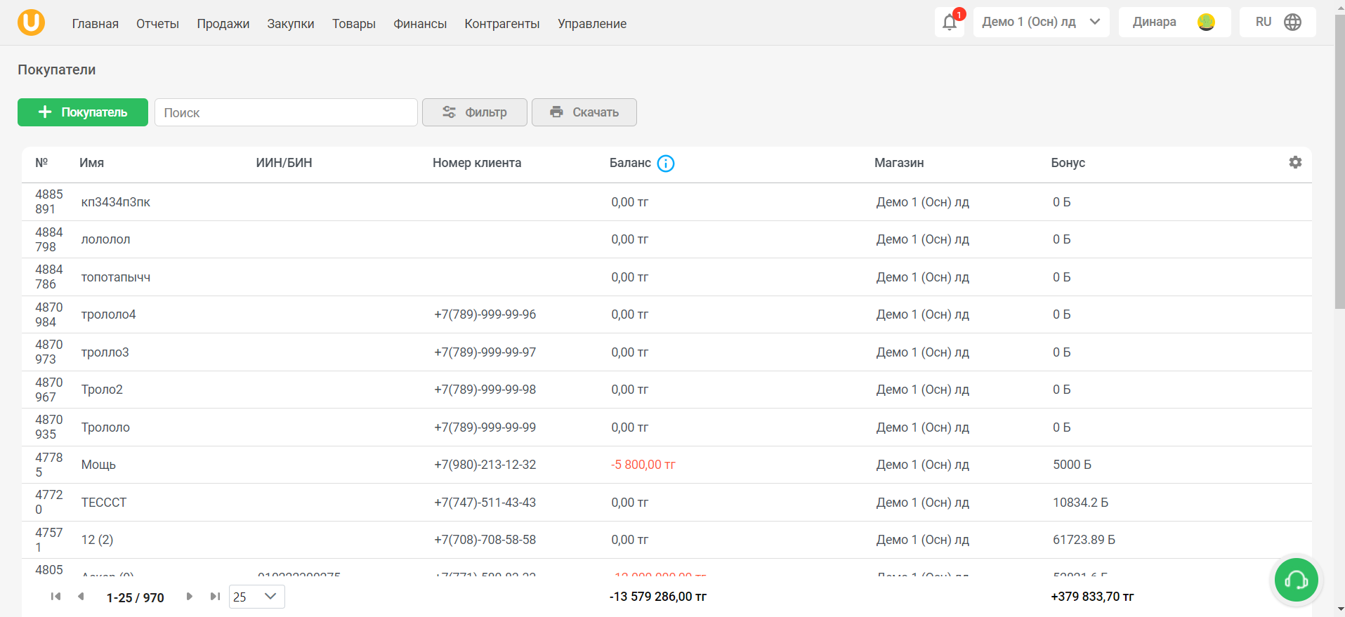 Раздел "Покупатели" нужен для того, чтобы отслеживать бонусы/долги и покупки ваших покупателей. Для того, чтобы перейти в раздел “Покупатели”, в боковом меню выберите “Контрагенты” → “Покупатели”.