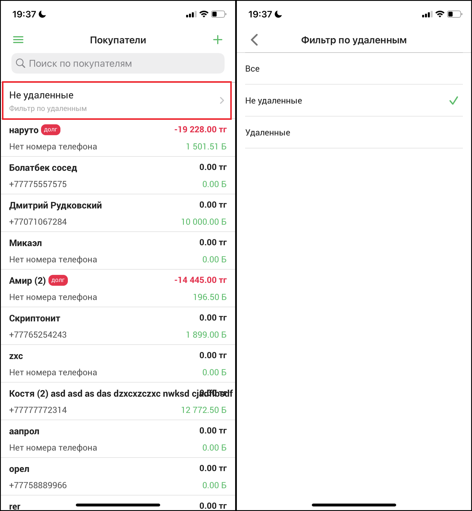 Для того, чтобы показать удаленных покупателей, нажмите на на поле “Фильтр по удаленным” и поставьте галочку в пунктах “Все”, “Не удаленные”, либо “Удаленные”, чтобы показать необходимых вам покупателей в списке.