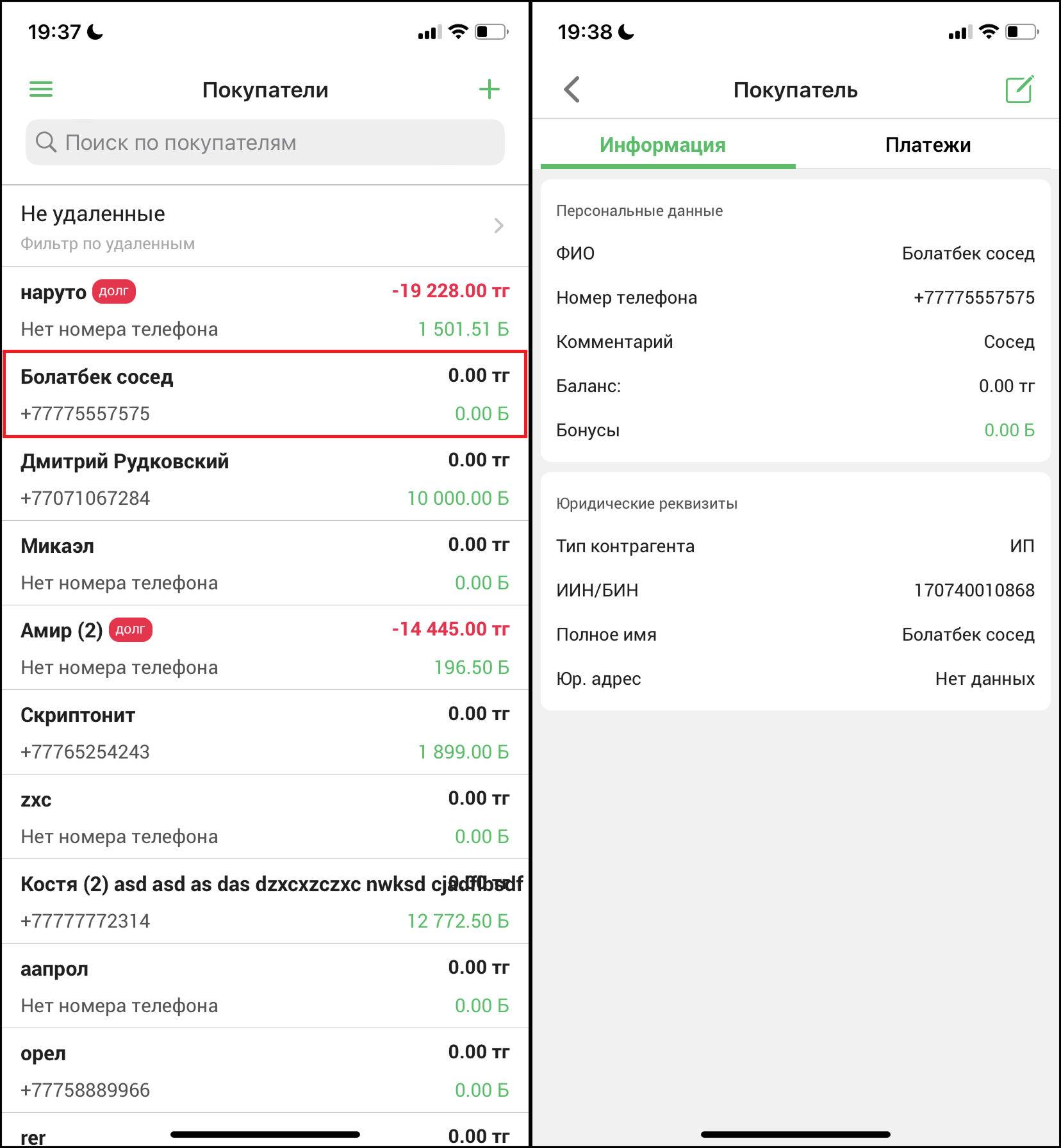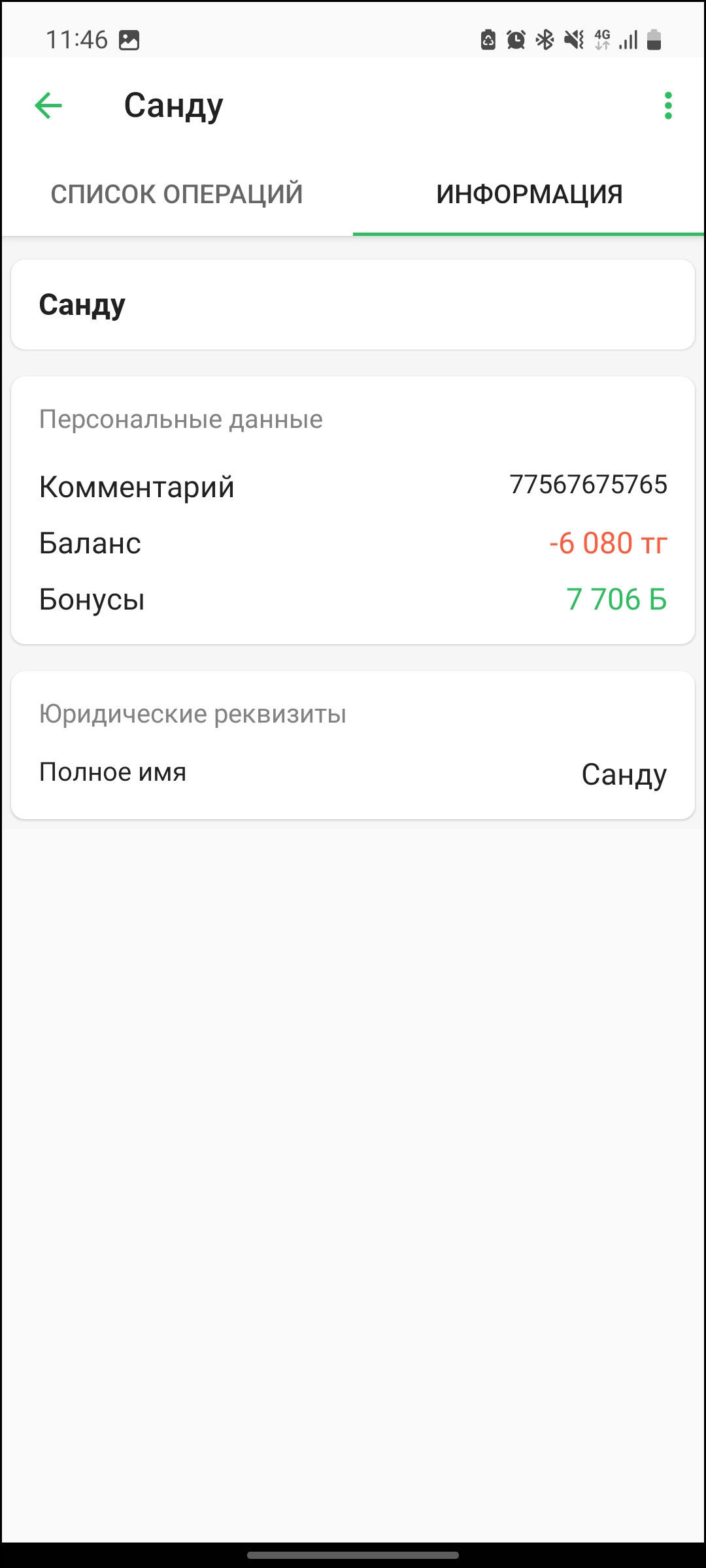 Откроется страница “Покупатель”, где вы можете найти полную информацию о покупателе - имя контактного лица, телефон, баланс, бонусы. Вы можете оставить комментарий в поле “Комментарий” в правой верхней части страницы. Также, вы можете найти юридические реквизиты покупателя - ИИН/БИН, тип контрагента, полное название, юридический и физический адреса.