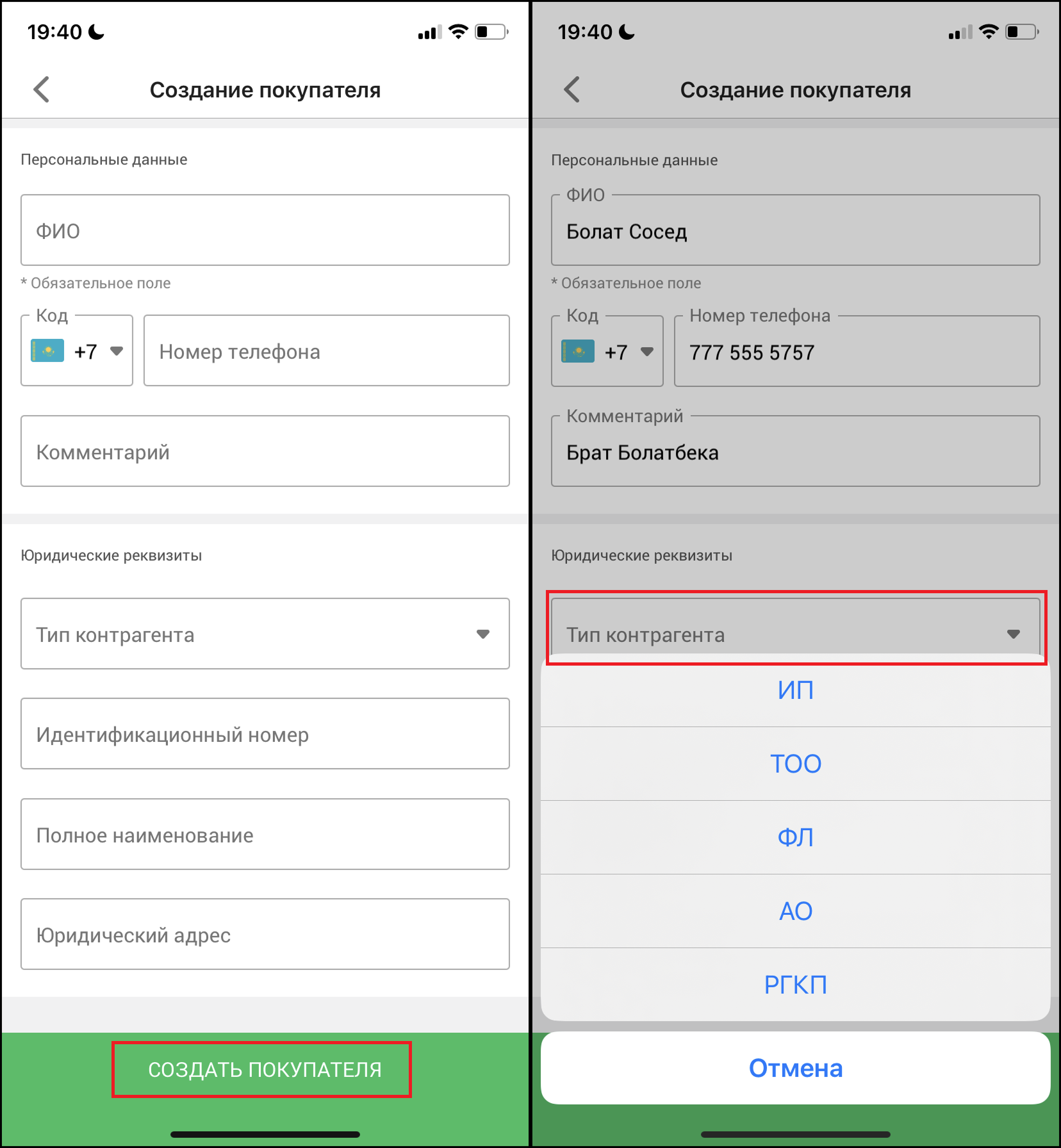 При необходимости заполните юридические реквизиты покупателя. Нажмите на кнопку “Сохранить”, чтобы создать нового покупателя.