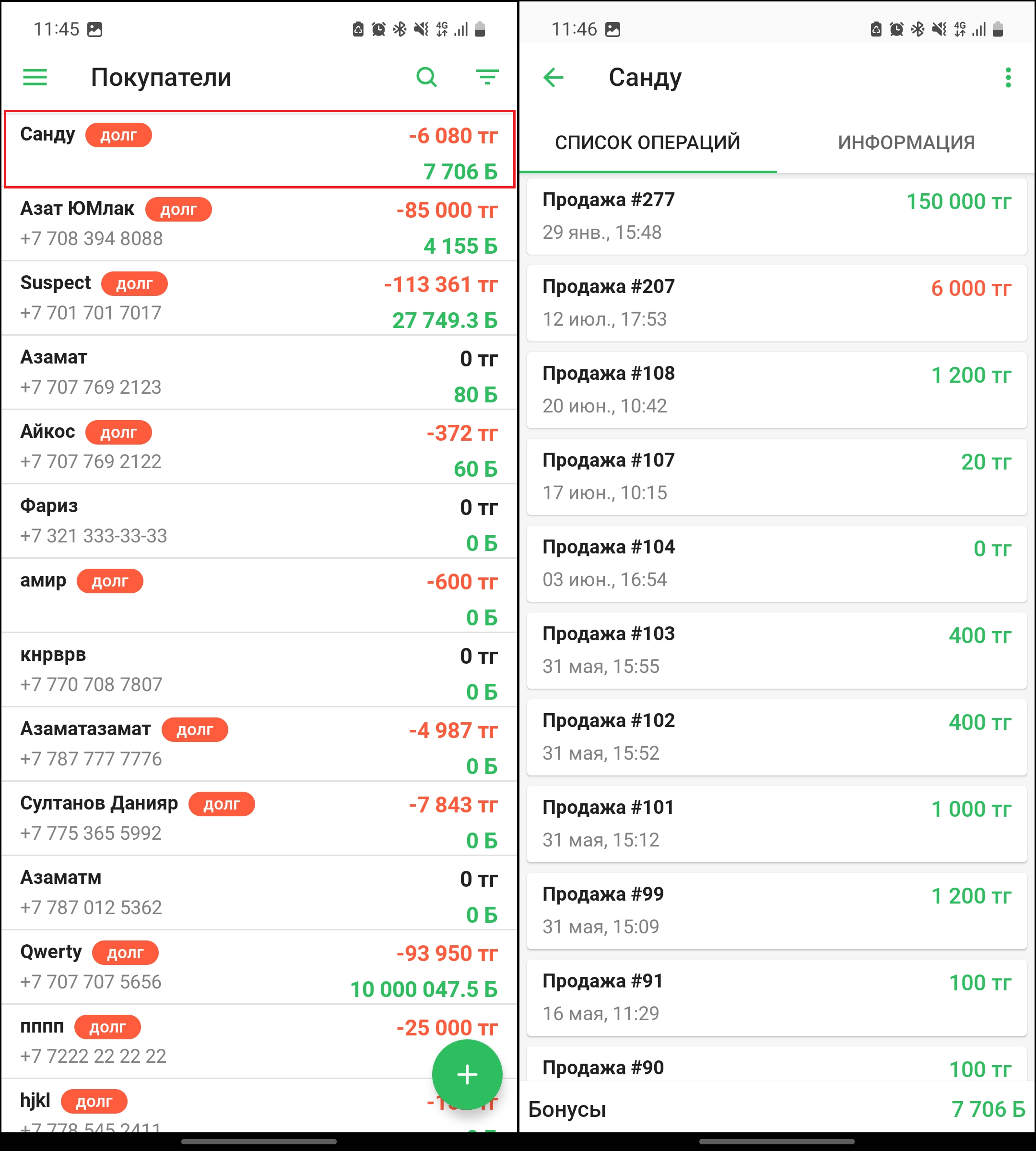 Список клиентов содержит некоторую информацию о клиентах - имя, мобильный номер телефона, баланс, а также сумма бонусов на счету клиента.