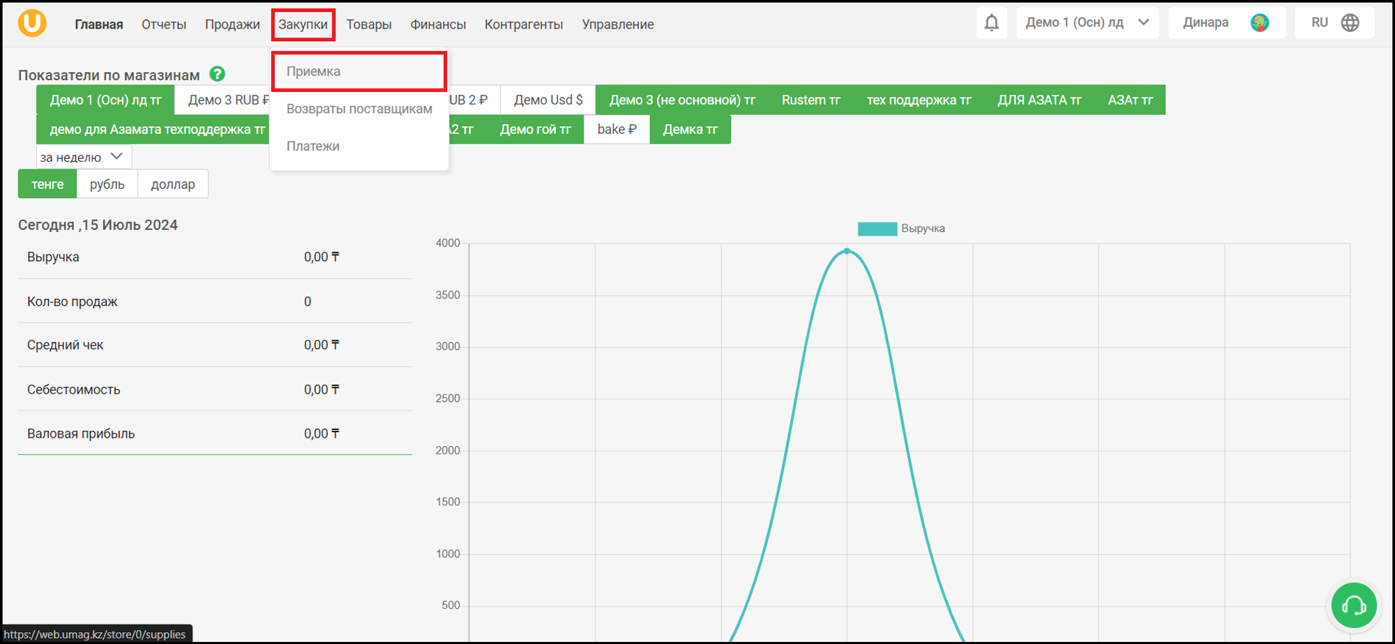 Для того, чтобы перейти в раздел “Приемка”, в верхнем меню выберите “Закупки” → “Приемка”.