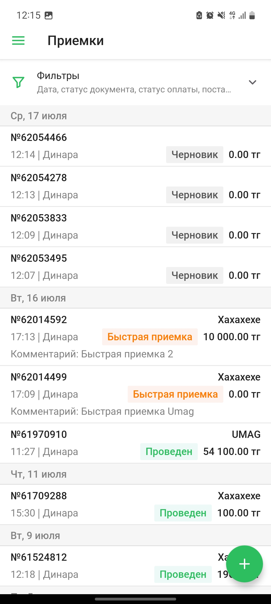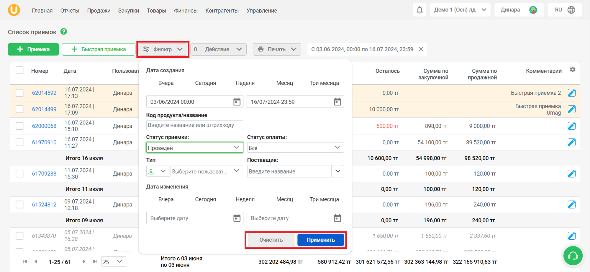 Список приемок содержит в себе информацию о приемках - дата и время, номер приемки, сумма приемки, пользователь, поставщик, статус документа и комментарий. Черновики документов приемки помечены тегом ”черновик”, проведенные приемки помечены тегом “Проведен”, быстрые приемки помечены тегом “Быстрая приемка”.