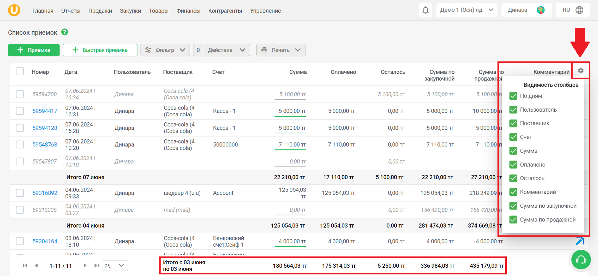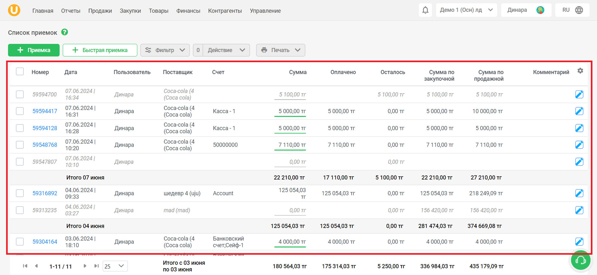 Список приемок содержит в себе информацию о приемках - номер, дата приемки, пользователь, совершивший приемку, поставщик, счет, сумма приемки, оплаченная и оставшаяся сумма, сумма по закупочной/продажной цене, а также комментарий к приемке. Черновики документов приемки помечены серым цветом, а проведенные приемки помечены синим цветом.