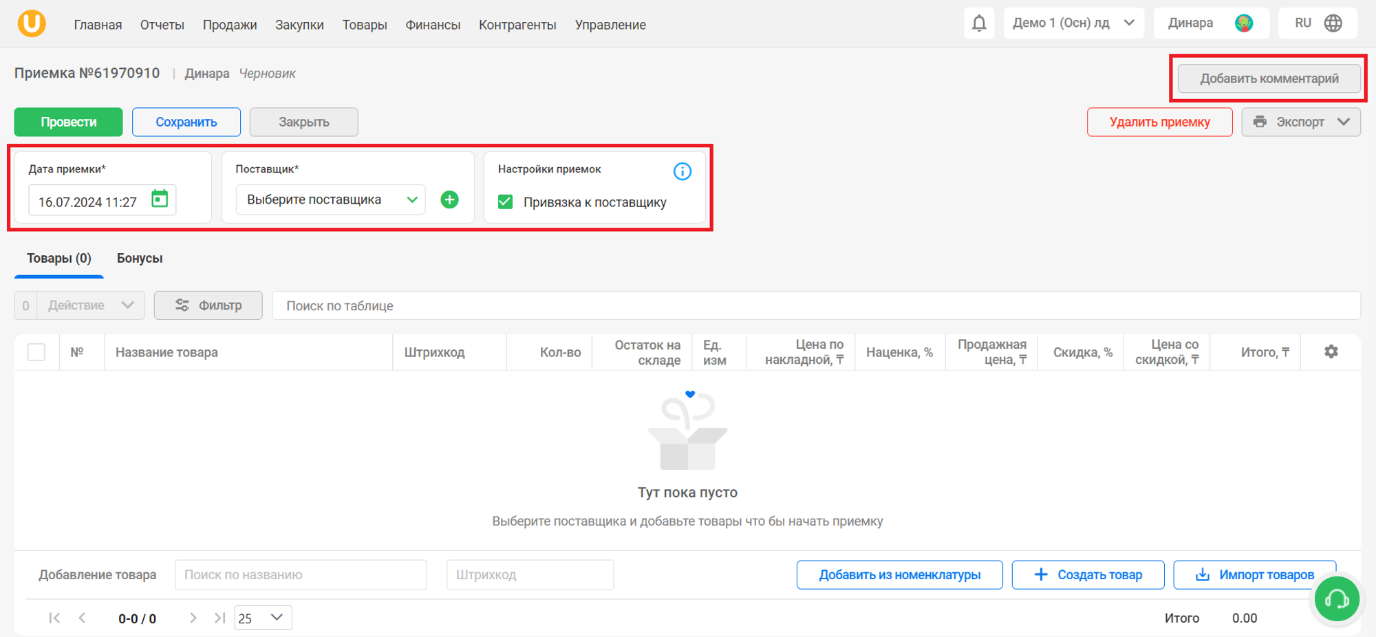 Откроется страница редактирования приемки. Создастся приемка со статусом “Черновик”. Для того, чтобы провести приемку, необходимо указать дату приемки и поставщика. Также, вы можете привязать приемку к поставщику, отметив галочкой пункт “Привязка к поставщику”. Также, вы можете добавить комментарий к приемке, нажав на кнопку “Добавить комментарий” в правом верхнем углу страницы.