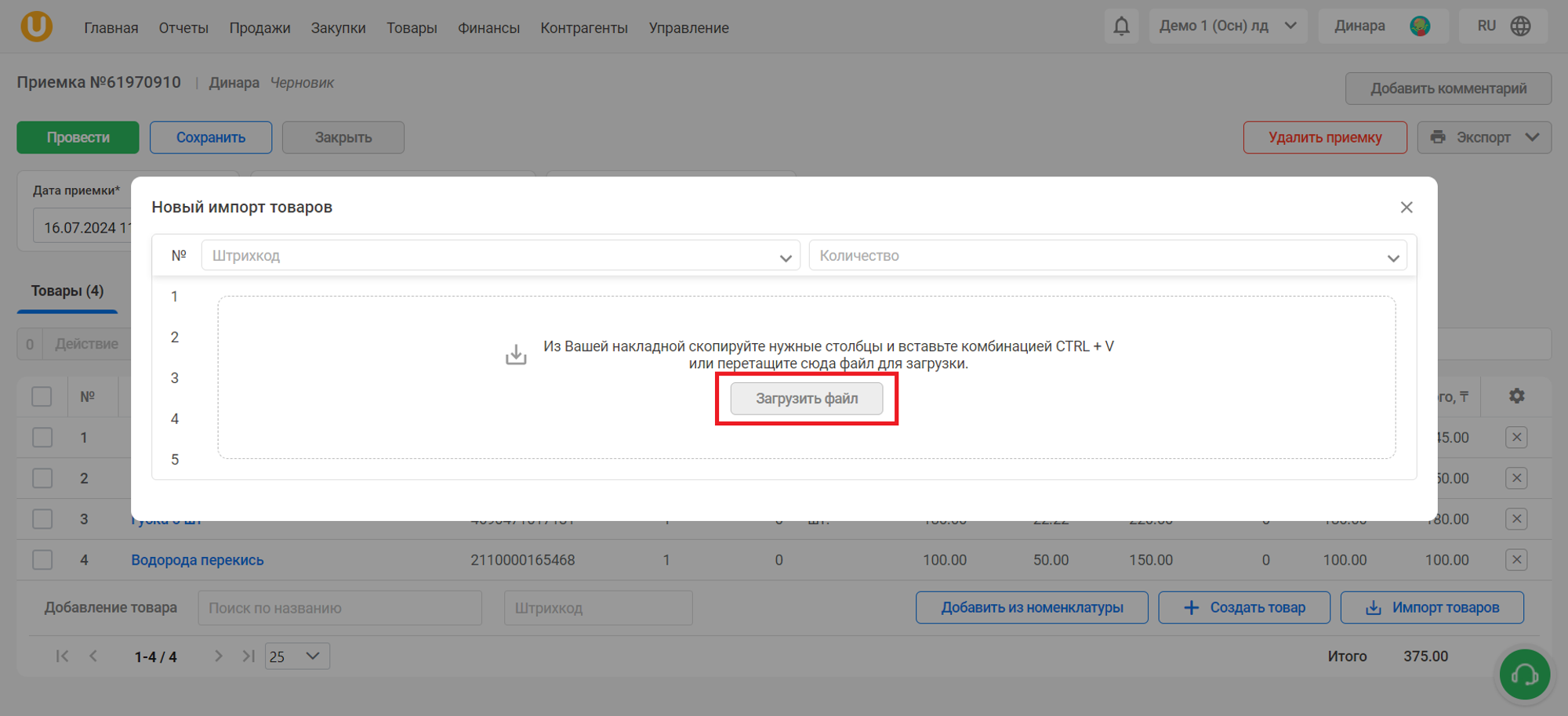 Откроется окно “Новый импорт товаров”. Скопируйте и вставьте необходимые данные, либо нажмите на кнопку “Загрузить файл”, чтобы загрузить файл с данными для импорта товаров, к примеру, из накладной.