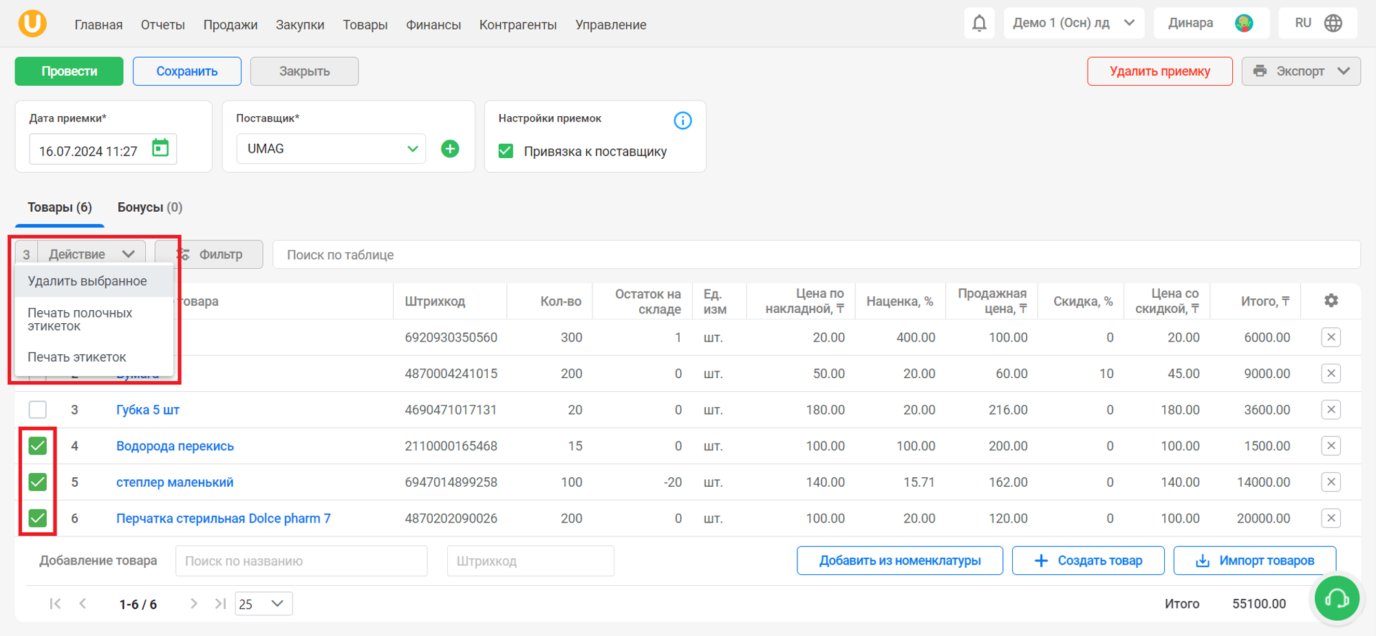 Выделите необходимые товары из списка и нажмите на кнопку “Действие”, чтобы выполнить действия над товарами. Нажмите на “Удалить выбранное”, чтобы удалить выделенные товары, либо нажмите на “Печать полочных этикеток” или “Печать этикеток”, чтобы распечатать этикетки для выделенных товаров.