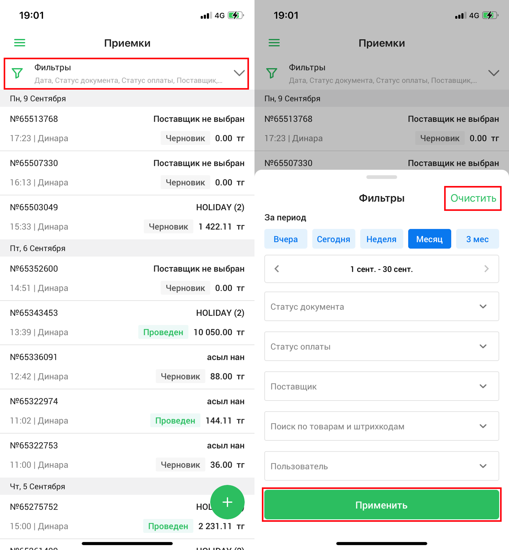 Нажмите на поле фильтра в верхней части экрана, чтобы воспользоваться фильтрацией. Откроется страница “Фильтры”. Вы можете настроить фильтр по дате, статусу документа, статусу оплаты, поставщику, пользователю и продукту. Настройте параметры фильтрации и нажмите на кнопку “Применить”, чтобы применить фильтр, либо нажмите на кнопку “Очистить”, чтобы сбросить фильтрацию.